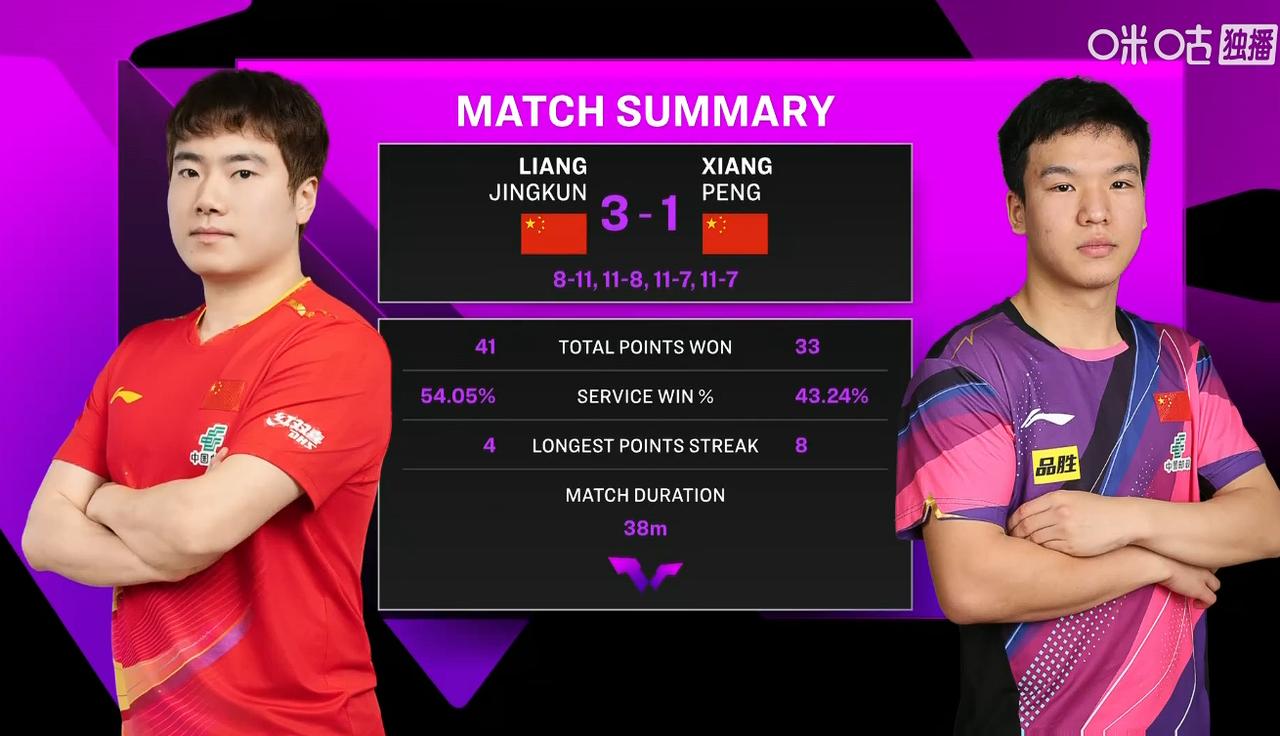 甜甜呀,你还是一样的配方呀![捂脸]WTT重庆冠军赛男单 1/16 决赛,梁靖崑 3-1 战胜队友向鹏,又是一场 “先丢一局然后开杀” 的名场面! 第一局,梁靖崑开局主打反手速胜(靠线路变化),但向鹏韧性十足,顶住了前三板的压制,并在中远台对拉环节打出了高质量,抓住了梁靖崑的失误,逆转拿下了第一局。 第二局,大胖就直接开启了 “不讲理” 模式,迅速调整,放弃速效,主打正手控制,增加台内摆短与搓长的比例,逼迫向鹏主动上手,从而在向鹏进攻时打出高质量的反手反撕与正手大角度对冲,有效限制了向鹏的上手率。 第三和第四局,明显节奏在大胖手里。尤其是第四局 7-7 平后的那段爆发,挺稳! 虽然今天这场国乒内战打得抽象,但能赢就是硬道理!下一轮对阵party哥,大胖继续冲! WTT冠军赛重庆站丨男单1/16决赛 梁靖崑🇨🇳 3-1 向鹏🇨🇳【8-11,11-8,11-8,11-7】 下一轮对阵:梁靖崑🇨🇳 VS 邱党🇩🇪