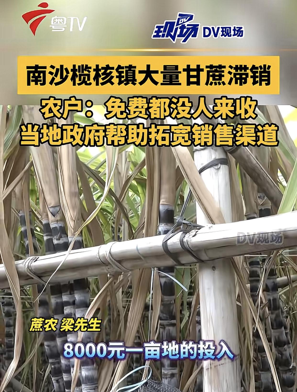 “白送都没人要!” 广州南沙榄核镇的蔗农今年真的要血亏了!由于甘蔗滞销,可以说是根本卖不出去,三月份的甘蔗还在地里。 蔗农:“南沙蔗农欢迎你坐飞机过来自己砍,不要钱,砍多少都不要钱!” 有条件可以去买点,我上周日过去买了10根,2块钱一根,很脆很甜。广州现在15块一根,过年还是16-18块一根。 应该是过年的时候卖太贵了,如果便宜点的话,多销一点,现在也不会剩这么多。想买的买不到,想卖的卖不了,看着物流发达,怎么就没人来收购呢?春耕时节也到了,还卖不出去那就难搞了。