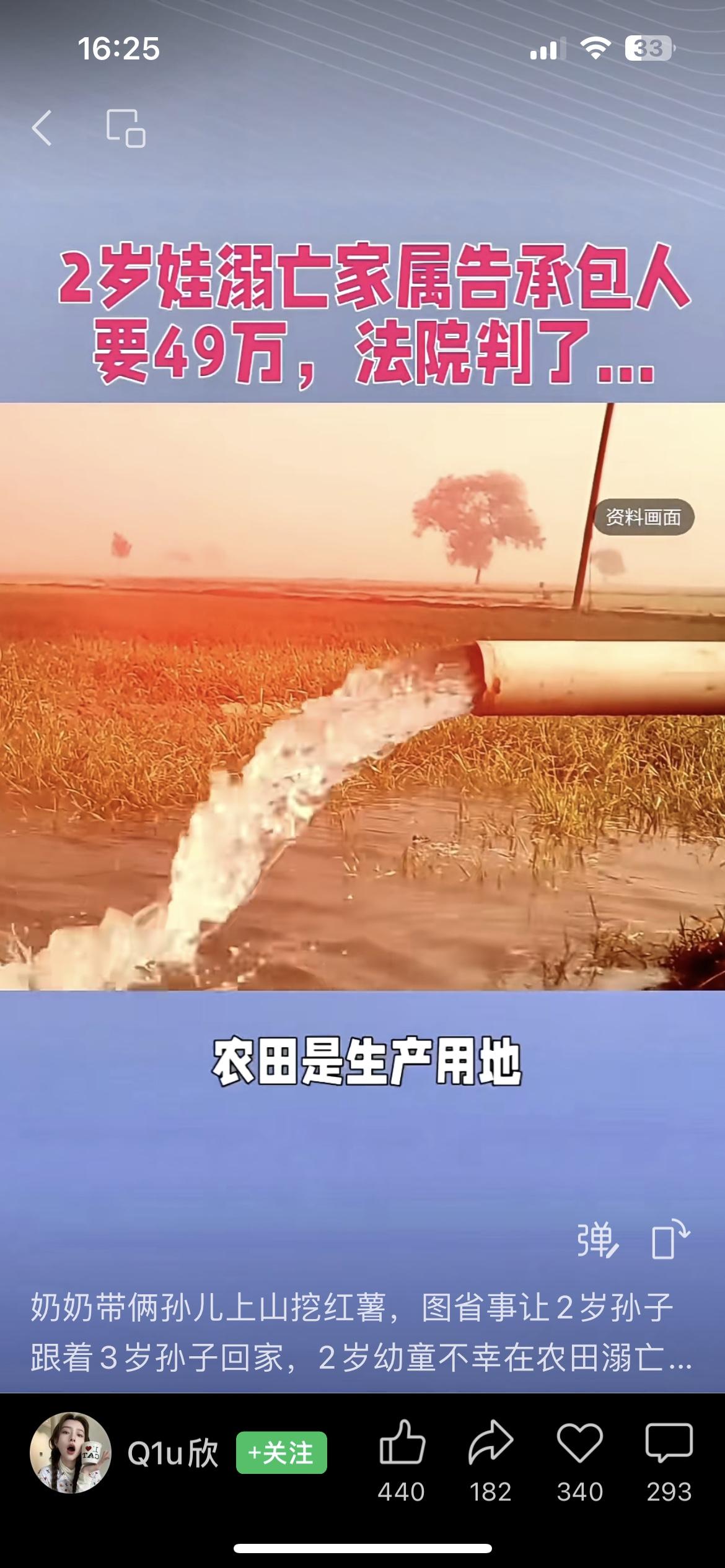 两岁娃在水田溺亡,家属把田主告上法庭索赔 49 万,被法院霸气驳回。奶奶吴某带着两岁和 3 岁的孙子去田里挖红薯,让 3 岁的哥哥带着两岁的弟弟先回家。两岁弟弟不慎落入水田淹死,家属非常伤心,把田主告上了法庭要求赔偿,一审法院驳回判决,二审家属要求酌情赔偿,法院依然驳回。法院审理认为稻田是生产场所,不是公共场合,作为田主没有照看孩子的义务,是监护人失责才导致孩子身亡。