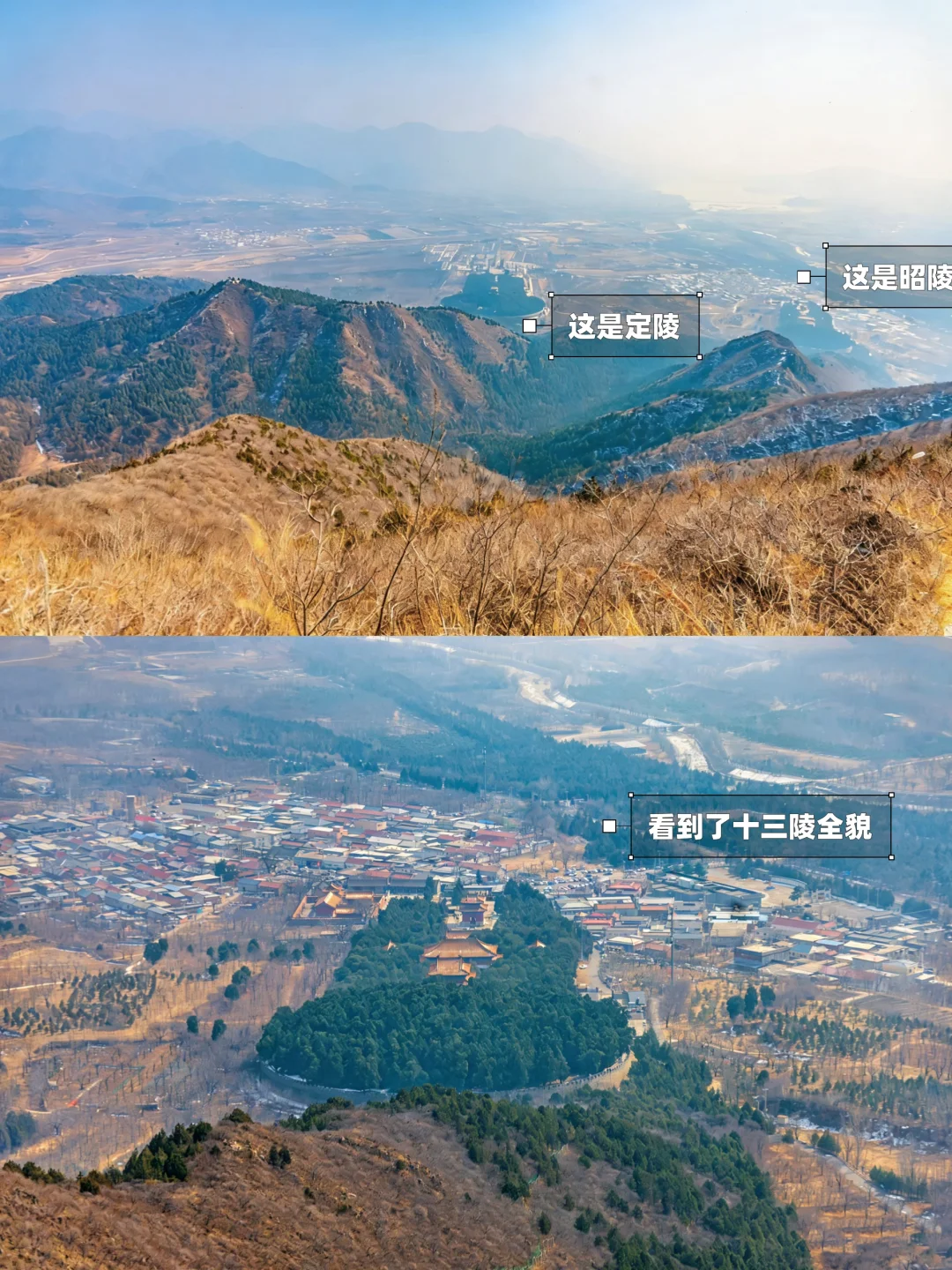👟前半程一样,后半程从瞭望台走山脊野路下山,可以看到明十三陵的定陵和昭陵的全貌。但是这条路线太野,树枝刮、岩土路高低不平,想体验野山的有徒步经验的朋友们可以尝试,新手不建议‼️