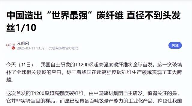 日本怎么也没想到,中国也能搞出T1200碳纤维,更关键的是,咱们不是实验室里搞出几根样品发个论文,而是直接搞出了百吨级的量产。 陈秋飞从北京化工大学碳纤维方向硕士毕业,就直接去了中复神鹰,那年他25岁。公司当时在连云港建厂,他从基层技术员干起,负责原丝纺丝参数记录和设备调整。后来主导干喷湿纺技术攻关,团队连续攻克T300到T700、T800级千吨产线。 他参与建成国内首条T300千吨线,又推动T700、T800稳定生产。过程中拿到国家科技进步一等奖,获得多项专利。2025年升任总经理后,负责T1200级SYT80研发,带领团队突破亚纳米级缺陷调控,实现从实验室到工程化的跨越。2026年3月11日,产品全球首发,他作为研发负责人,推动百吨级产能落地。 中复神鹰SYT80(T1200级)碳纤维工程化拉伸强度突破8000MPa,拉伸模量324GPa,断裂伸长率2.5%,体密度1.79g/cm³,比上一代SYT70提升14%。单丝直径6-7微米,不到头发丝十分之一,拉伸强度是普通钢材10倍,密度只有钢材四分之一。一束12K(12000根单丝)纤维理论上能吊起两架C919飞机。这不是实验室小样,而是建成百吨级工业生产线,合格率稳定,连续生产。 全球范围内,东丽公布T1200实验室成果,强度提升10%以上,但三年过去仍停在实验室验证,没实现规模量产。美国赫氏、日本东邦等也只在样品阶段。中国中复神鹰攻克工程化瓶颈,靠成熟工业体系、多年工艺积累和装备自主,从原丝到碳化全链条国产化,避免外部依赖。这直接把高端碳纤维从技术壁垒转向产能主动,我国成为全球首个实现该级别百吨级量产的国家。 这项突破发布后,迅速进入航空航天、商业航天验证。用于大飞机结构件减轻重量,提高运载效率;商业航天火箭壳体、卫星支架;低空经济飞行器框架;人形机器人关节;氢能储运罐体缠绕,提升耐压。中国建材集团规划连云港3万吨基地,推进更高水平产能。 陈秋飞继续负责优化和爬坡,针对应用调整规格,确保材料稳定落地。中国碳纤维市场份额已接近全球一半,在超高强度领域完成反超,为战略新兴产业提供核心支撑。这步走在前列,产业链安全升级,材料自主可控成为现实。