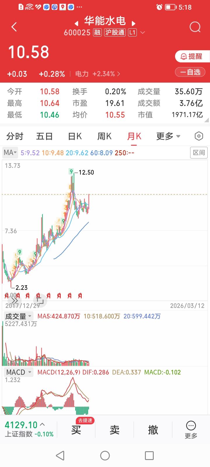 华能水电,今天收盘上涨0.28%,走出高位阳十字星,看来明天要倒车接人了。 危中有机,遇弱则强,没想到华能水电能逆势走出十一连阳。成了各路资金的避风港。 咱在10元以上就开始卖出华能水电,目前还剩三成的底仓。打死也不能再卖了。从月线上看,华能水电很可能会复制长江电力长牛慢牛走势。 如果跌破十元,果断补仓。其它情况耐心持股等待不动。