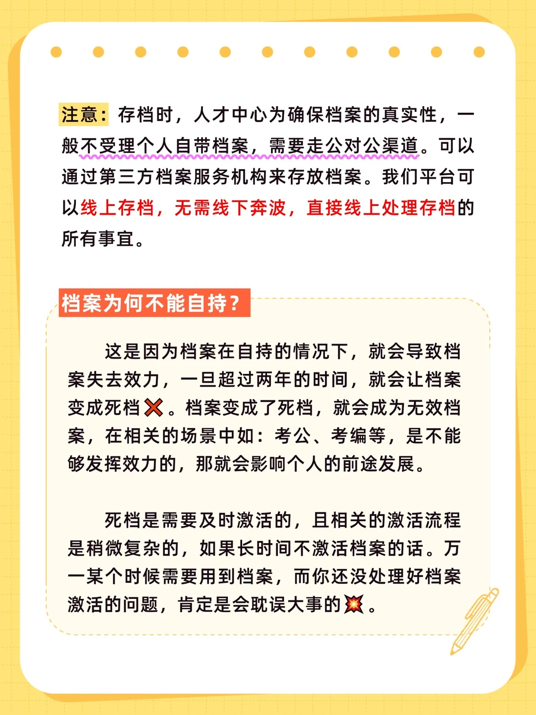 注意:存档时,人才中心为确保档案的真实性,一般不受理个人自带档案,需要走公对公渠道。可以通过第三方档案服务机构来存放档案。我们平台可以线上存档,无需线下奔波,直接线上处理存档的所有事宜。
