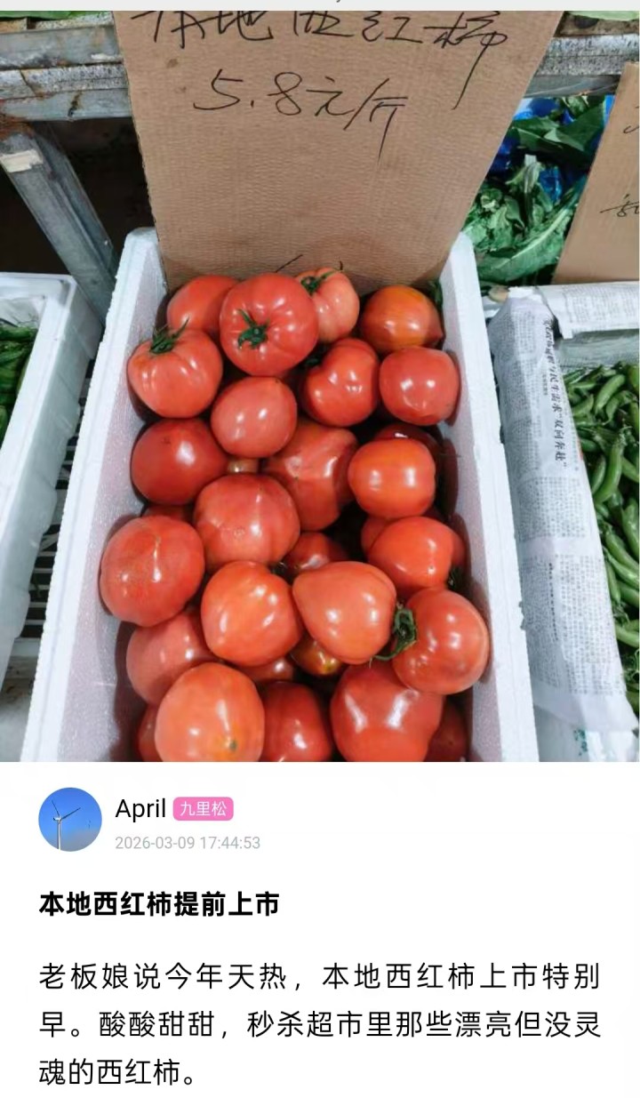 因为今年冬天气温偏高,原来春末才上市的本地番茄也提前上市了。量大管饱,购买方便,不像草莓番茄或者马蹄番茄,可能买不到。