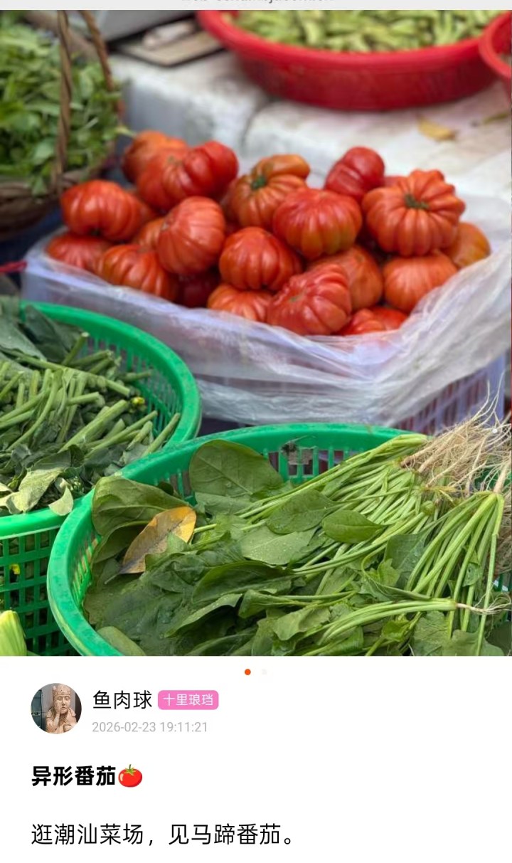 马蹄番茄底部一瓣一瓣的,有人说它有点像南瓜,对我们来说是新鲜物,对潮汕地区小伙伴来说则是老品种。橙友“鱼肉球”春节去潮汕玩还发帖晒过它。当然,现在它的种植区域也扩大了,像我买的,就来自山东寿光。