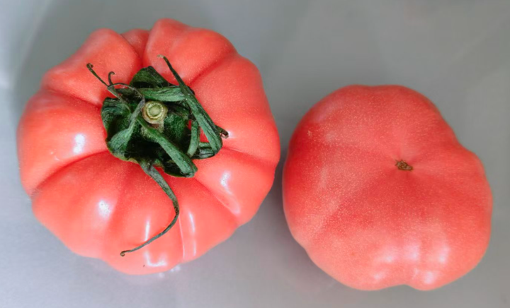 本地番茄酸酸甜甜,但颜值不如菜场超市常见的粉果或红果番茄,个头有大有小,熟了以后外皮偏软,很容易磕碰伤,还是限时供应,夏天一过就下市了。一年四季能买到的粉果和红果番茄,个头匀称,颜色鲜亮。但是,就像橙友“April”说的,好看归好看,“它们没有灵魂”,没有大家记忆中的番茄味。