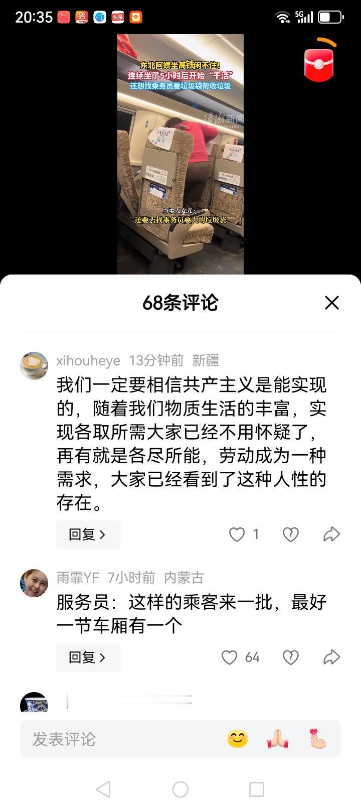 东北阿姨高铁上的表现很拉风 收拾座椅,还要替成员收拾垃圾 近日,来自山东的一条视频报道吸引了我的目光。 一位东北阿姨在乘坐了5个小时的高铁后,见车厢内乘客很少了便起身将整个车厢的座椅全部扶正立直。 然后,她还准备去找乘务员要垃圾袋,将整个车厢的垃圾收拾一下。 但此时,与她同乘车的女儿忍不住制止了她 : 那是乘务员的工作,你不要参与! 这条视频发出后有两个评论很有代表性: 第1条,东北人都是活雷锋! 第2条,共产主义一定会实现的因为现在已经露出了各尽所能的端倪。 哈哈,看到这样的消息,还是很为东北大姐点赞的。 毕竟,近年来一些中老年人在公共场合的不良举动占了主流报道。 什么与年轻人拒绝座位,上班高峰期年轻人抢占公交资源,欺负年轻人,无理取闹,等等。 本视频中这位主人公让我们看到了一束光,这束光将令温暖社会环境,也将像一面照妖镜,照出个别老年人的不良表现! 为这位来自东北的中年大姐点个赞吧。