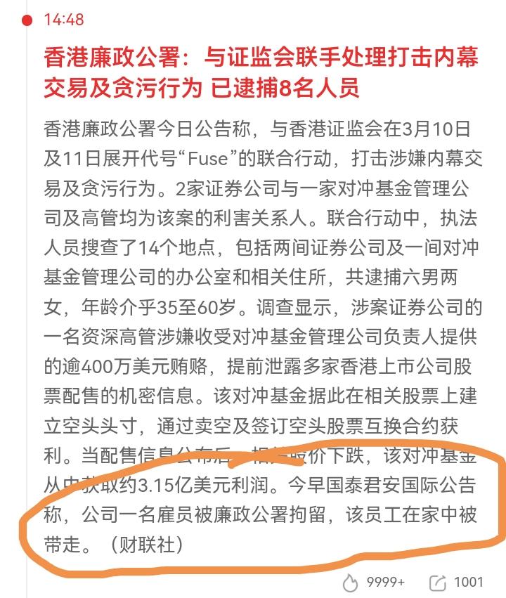 券商龙头突发利空,对行业冲击有多大?中信证券公告:香港子公司一名员工被廉政公署问话。国泰君安国际公告称,公司一名雇员被廉政公署拘留,该员工在家中被带走。 上面的意图再明确不过了,开始重拳打击资本市场违法行为,比如内幕交易/操纵股价等,严重危害市场的公平原则。 此次事件短期来看,可能引发资金避险,对股价有一定压力。长期来看,对券商的合规性要加强管理。 中信这个大头空,在散户的心中,印象一直都不好。就算罚它也不值得同情,股价大跌也是活该。