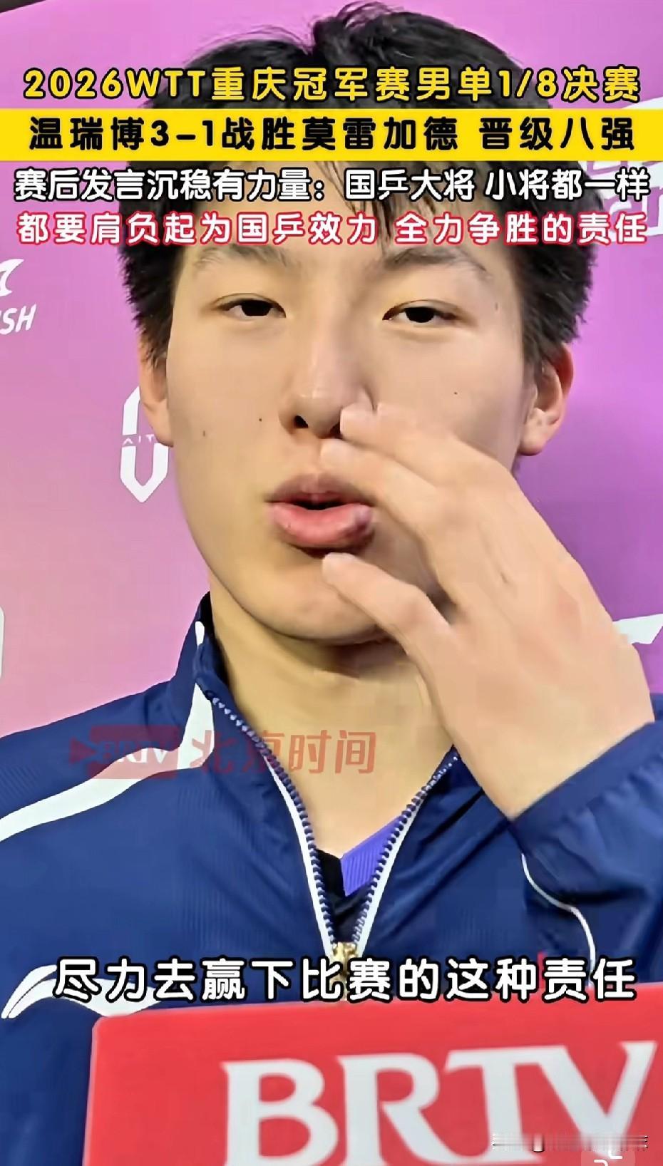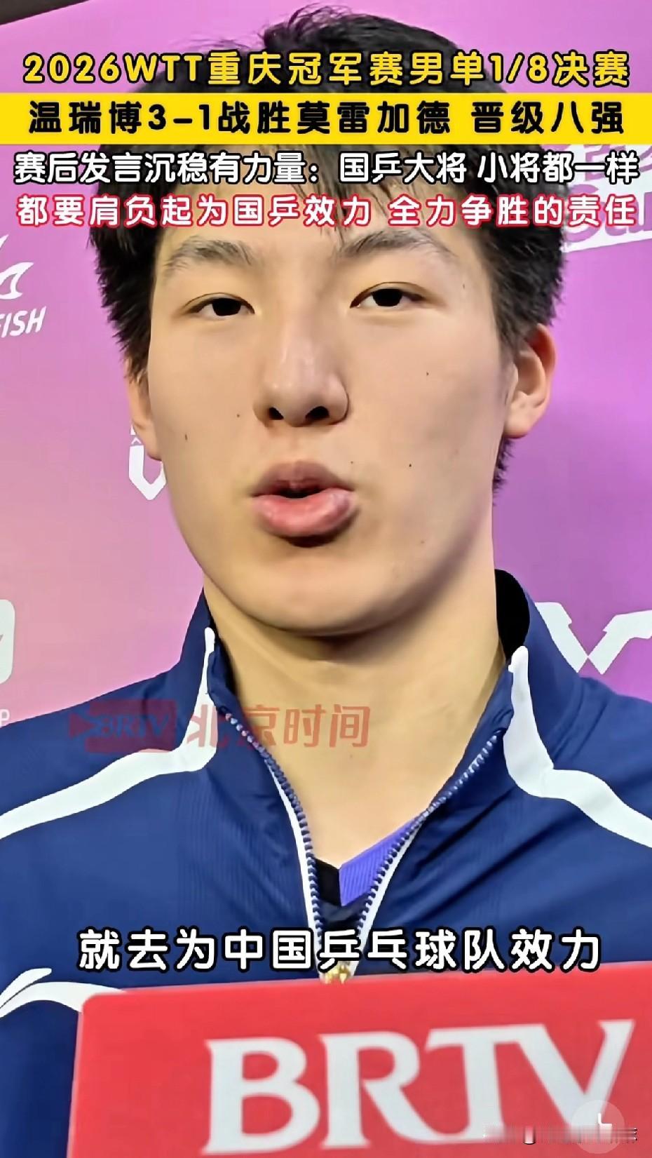 小温也是燃起来了!恭喜温瑞博3-1战胜莫雷加德,强势晋级重庆冠军赛男单八强!🔥 整场比赛看得人热血沸腾!小温在场上敢打敢拼、状态拉满,侯老师的解说同样激情满满,直接把观赛氛围点燃到极致! 一个在赛场燃,一个在解说室燃,边上的周冠达都栓不住,小温老侯两人一起晋级燃气主理人得了![捂脸] 赛后采访,小温格局拉满、发言超有觉悟: “不管小将、大将,都要承担起为国乒效力、全力争胜的责任。” 国乒从来不是靠一个人撑起荣光,而是每一位队员并肩扛起、全力以赴。这一份担当与传承,正是最动人的国乒精神!