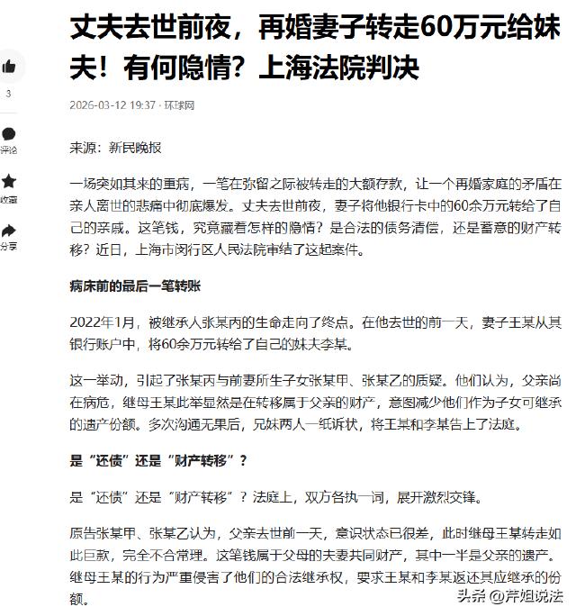 上海,男子张某病危之际,二婚妻子王某将其卡内60万转给妹夫李某。张某与前妻的继子继女发现后,认为其中一半是父亲遗产,自己有份,要求王某返还。王某却称这60万是妹夫借款,拿去还债无需返还。双方各执一词,沟通无果后对簿公堂。法院审理时,王某拿不出借款凭证,其收入情况与借款能力不符,且她自称不太会用银行卡却有多笔交易记录。最终法院认定60万是夫妻共同财产,判决王某返还继子女可继承的钱款。 太离谱了,人都快不行了,不想着好好照料,反而先想着转移财产,这心思也太坏了。 先说说这家人的关系,本来就很微妙。张某有一儿一女,是和前妻生的,后来二婚娶了王某。 继子继女和继母王某,本来就没什么血缘关系,平时相处估计也隔着一层,更别说涉及到钱的事了。 出事是在2022年1月,张某那时候已经病重得不行了,生命垂危,谁都能看出来,没多少日子了。 可就在张某去世的前一夜,王某却偷偷把张某银行卡里的60多万,全转给了自己的妹夫李某。 这事一开始没人知道,直到张某去世后,继子继女去整理父亲遗物、查询银行卡流水,才发现这笔钱不见了。 俩人当时就炸了,气得不行,觉得继母这就是故意转移父亲的财产,趁着父亲病危,没人管,偷偷把钱挪走。 他们找到王某,要求她返还属于他们的那部分份额,毕竟这钱里,有一半应该是父亲的遗产,他们作为子女,有继承权。 可王某却嘴硬得很,死活不承认自己转移财产,坚称这60万不是张某的个人财产,也不是遗产,是妹夫李某之前借她的钱。 她还说,这笔钱是用来还债的,2017年的时候,妹夫就多次带现金来上海给她,直到2018年才存进银行,现在只是还给妹夫而已。 这话谁能信?继子继女当场就反驳了,要求王某拿出借款的证据,比如借条、转账记录之类的。 可王某和她妹夫李某,翻来覆去,什么证据都拿不出来,既没有借条,也没有当年李某给她现金的凭证,全是口头说法。 沟通来沟通去,王某就是不返还钱,继子继女也咽不下这口气,没办法,只能对簿公堂,靠法院来评判。 法院一介入调查,王某的谎言很快就被戳穿了,说法漏洞百出,根本站不住脚。 法院查了王某的收入情况,发现她的收入水平,根本没有能力借给妹夫60万,所谓的借款,就是无稽之谈。 更可笑的是,王某在法庭上还自称,自己不太会用银行卡,可法院调取的流水显示,她有很多笔银行卡交易记录,根本不是不会用的样子。 这一下,王某的辩解彻底站不住脚了,所有的证据都指向她,就是故意转移财产。 王某转走的60万,到底属于什么财产? 根据《民法典》第一千零六十二条,夫妻在婚姻关系存续期间所得的工资、奖金、劳务报酬,生产、经营、投资的收益等,为夫妻共同财产,归夫妻共同所有。 张某卡内的60万,是他与王某婚姻关系存续期间的财产,应认定为夫妻共同财产,其中一半属于张某的个人财产,在张某去世后,成为遗产。 王某称是借款还债,为何法院不认可? 根据《民事诉讼法》第六十七条,当事人对自己提出的主张,有责任提供证据。 王某主张60万是妹夫借款,却无法提供借条、转账记录等任何证据,应承担举证不能的后果。 即使是夫妻共同财产,一方也不能擅自处分,尤其是在另一方病危、涉及遗产继承时,擅自转移财产,不仅违背道德,更可能触犯法律。 王某自称不会用银行卡,却有多次交易记录,这种矛盾的陈述,会被法院认定为虚假陈述,不仅影响其主张的可信度,还可能被追究妨碍民事诉讼的责任,得不偿失。 夫妻本应患难与共,王某却在张某病危之际,盘算着转移财产,眼里只有钱,没有夫妻情分,这种行为不仅寒心,更是对逝者的不尊重,最终被法院判决返还钱款,纯属自食其果。 继子女维权无可厚非,遗产继承不是儿戏,不是一方可以随意侵占的。 王某试图用谎言掩盖转移财产的事实,却忽略了法律讲究证据,任何试图钻法律空子、侵占他人合法权益的行为,终究会被揭穿,受到应有的惩罚。 最终,法院认定张某卡内的60万为张某与王某的夫妻共同财产,其中30万属于张某的个人遗产。 因王某无法提供借款凭证,其辩解不成立,判决王某返还继子女可继承的相应钱款,维护了继子女的合法继承权。 一场遗产纠纷,看清了人心冷暖,也彰显了法律的公平公正。 王某的行为值得谴责吗?继子女维权是合理的吗?快来评论区说说你的看法。