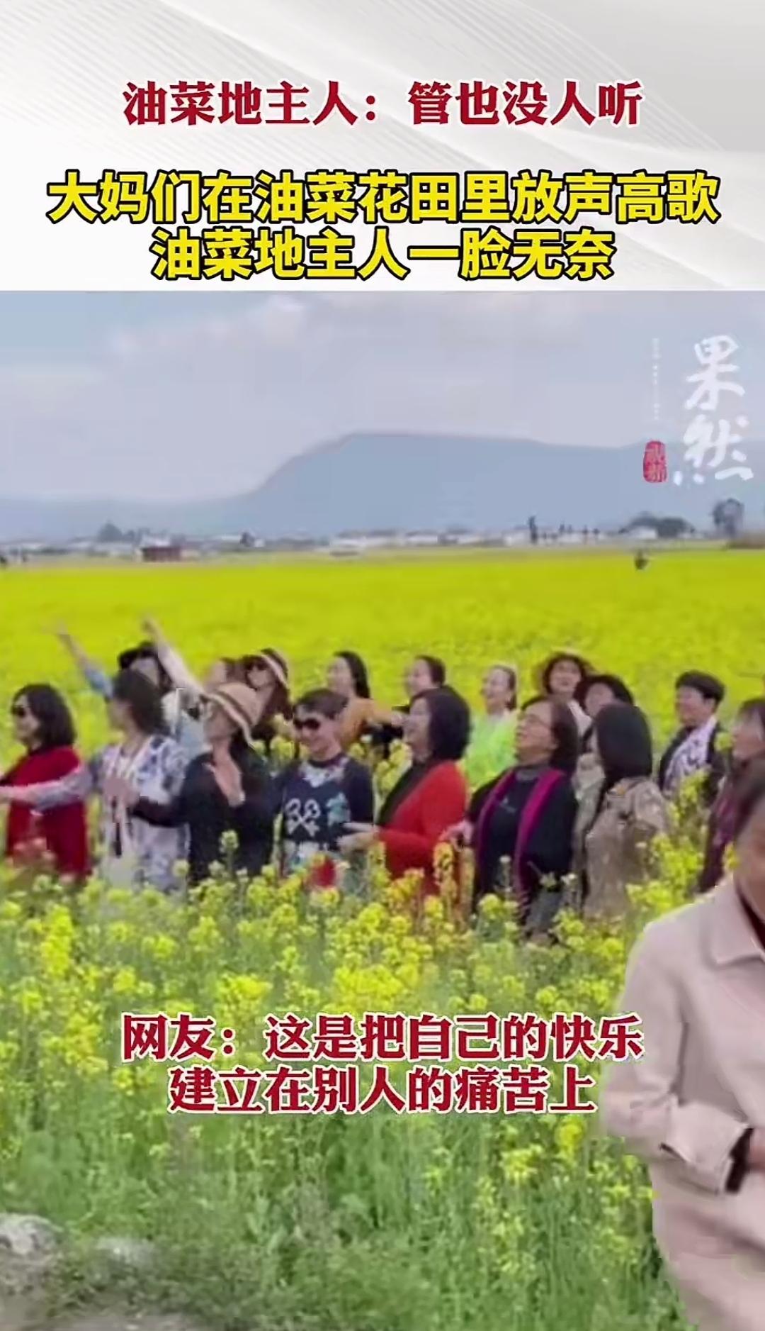 踏入油菜花丛中纵情高歌,即便菜地主好言劝阻也置若罔闻,这群大妈如此寻得的快乐,真能问心无愧吗? 瞧瞧画面里油菜地主人那无奈的神情,便可知被她劝阻的这群大妈有多缺乏公德。为了真切感受油菜花带来的春天气息,她们竟径直走进油菜地,引吭高歌,还拍视频记录。她们却不知,仅仅这一番踩踏,这片油菜或许就会失去榨油的价值,原本的经济收益化为乌有。 油菜花田旅游