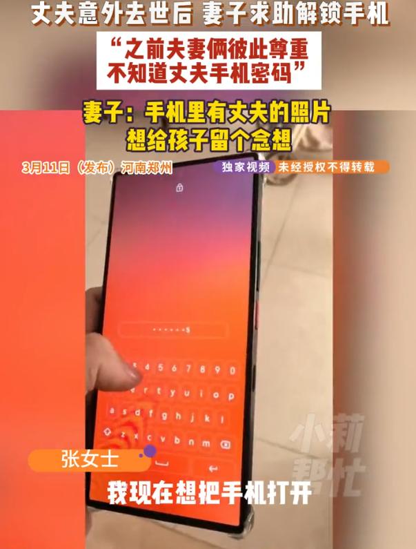 河南郑州,一男子意外去世,而唯一留下的念想就是一部手机,可因为之前夫妻俩互相尊重,妻子压根就不知道丈夫手机的开锁密码,她想把手机解锁却遇到了麻烦,听说有人要上万元,只能在网上求助,不过网友们却看法不一 说起来也是他们夫妻俩的习惯。结婚这些年,两人一直很尊重对方的隐私,从不互相翻看手机,也从来没问过对方的解锁密码 张女士说,那时候觉得这样挺好,给彼此一点空间。可谁能想到,丈夫突然就走了,连个密码都没留下 不过如何开锁,就成了大问题,他们询问过手机官方,解锁倒是没问题,可解锁后里面的资料就都没有了,这显然不是张女士所需要的 他们也询问了别人,有人说如果想要保存里面的资料解锁,要花费数万元,以张女士现在的经济条件也是不允许的 无奈之下,他只能联系媒体,在网上求助 网友们的评论也挺有意思,分成了两派 有一派网友说,男人的手机还是别打开为好。万一里面有点什么不该看的东西,人已经走了,活着的人反而知道了不该知道的,那不是给自己添堵吗?到时候孩子问起爸爸是什么样的人,你说还是不说? 另一派网友则觉得,真正的夫妻之间不应该有秘密。他们说自己和另一半的手机密码都是互相知道的,随时可以翻看对方的手机。这才是正常的夫妻关系,透明的,没有隐瞒的 说实话,这两种说法都有道理。但我更想说的是另一件事 张女士和丈夫互相尊重隐私,这本身没错。每个人都需要一点私人空间,即使是再亲密的夫妻。但这件事提醒我们,隐私和纪念之间,是不是可以找一个平衡点? 比如说,家里的重要资料、照片,是不是可以定期备份一下?存在云端也好,拷到电脑里也好,或者干脆洗出来放在相册里。这样即使手机丢了、坏了,或者像张女士这样打不开了,至少不会失去所有珍贵的记忆 还有,夫妻之间可以商量好,万一发生意外,重要的东西怎么处理。可能有点晦气,但生活就是这样,谁也说不准明天会发生什么。一个简单的约定,也许就能避免张女士现在的困境