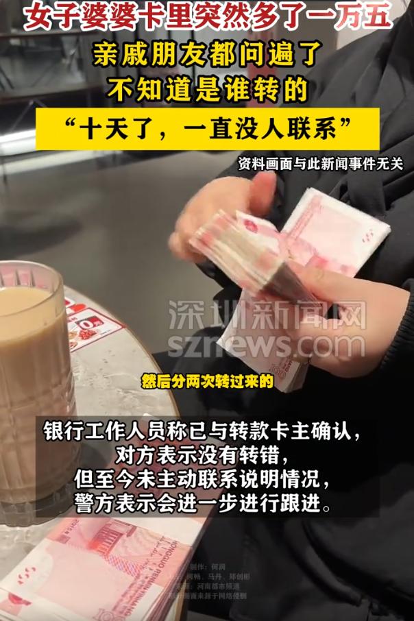 天上真掉馅饼了?河南郑州,女子晚上休息时,突然手机里收到两条信息,银行卡里突然多出两笔总共15000元的转账,可这凭空出现的钱却让一家人坐不住了,问了一圈,也没找到是谁转的,最后只能报警来解决 张女士介绍,当天晚上,她婆婆正准备休息,手机“叮”的一声,进来一条银行短信:到账10000元。老太太还没来得及反应,过了二十分钟,手机又响了,再次到账5000元 短短半小时内,银行卡里莫名其妙多出来15000块钱 这一下,全家人的瞌睡全给吓醒了。搁一般人想,卡里多钱了,这不是好事吗?但张女士一家压根高兴不起来,反而坐立不安。这钱是谁转的?转来干啥的?会不会是骗子设的什么局? 第二天一大早,张女士一家就开始四处打电话。亲戚、朋友、同事,甚至那些年借过钱的老账主儿,全问了个遍。结果所有人都摇头:没转啊,不是我们 这就怪了。钱不可能从天上掉下来,总得有个来路吧? 张女士越想越不踏实,最后只能报警。民警倒也利索,通过银行很快就联系上了转账的那个人。可接下来对方的一句话,直接把这事儿推向了更诡异的方向,对方坚称:我没转错 这话说得张女士更懵了:一个完全不认识的人,非说没转错,这唱的是哪一出? 目前,警方还在继续调查 有网友说:这是别人给自己转,又不是转给别人。这有啥不好的 其实这还真不见得就是好事,这几年,因为“天降横财”惹上麻烦的新闻还少吗?有人因为收了“误转”的钱,结果被卷入洗钱案;有人因为贪图小便宜,最后背上一身官司。 虽说眼下这笔钱的来源还没查清,但有一点是肯定的:这钱,不是自己的,最好一分都别碰 如果真是转错了,这事反倒简单了,对方发现后联系银行,或者报警,钱原路退回,皆大欢喜。但对方偏偏说没转错,又不认识收款人,这不就等于承认:我就是故意把钱转给一个陌生人的吗? 所以说,如果哪天真遇上这种“天上掉馅饼”的事,千万沉住气。别急着取钱,别听陌生人指挥,更别按照陌生电话里的要求“转回去”。但凡涉及钱的,多留个心眼总没错。最稳妥的办法,就是像张女士这样,报警处理,让专业的人去查这笔钱的来路 卡里突然多了1万5 转账人坚称没转错