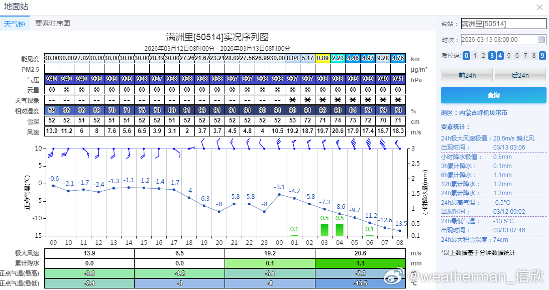 【满洲里积雪破纪录】今天凌晨满洲里出现降雪,并且伴随大风。雪不大,但风很大。可能因为风吹的堆积作用,积雪猛增到71厘米,打破当地观测史最深积雪纪录。图2-3为3月12日08时、13日08时观测站的雪深仪实拍图。