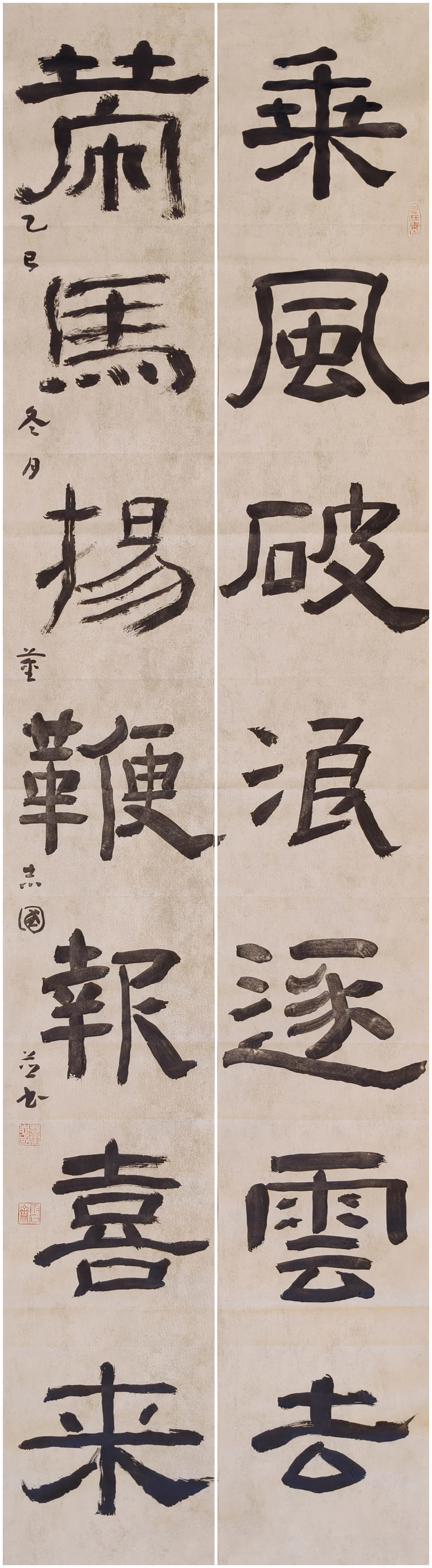 这是我自撰的一副对联。马年将至,“乘风破浪”对“策马扬鞭”很般配,都是四字成语,对仗工整。上联(平平仄仄平平仄),下联(仄仄平平仄仄平),读起来朗朗上口。从文义上来说,上联表达人们一年来在外奔波奋斗,下联表达年终回家满载而归。