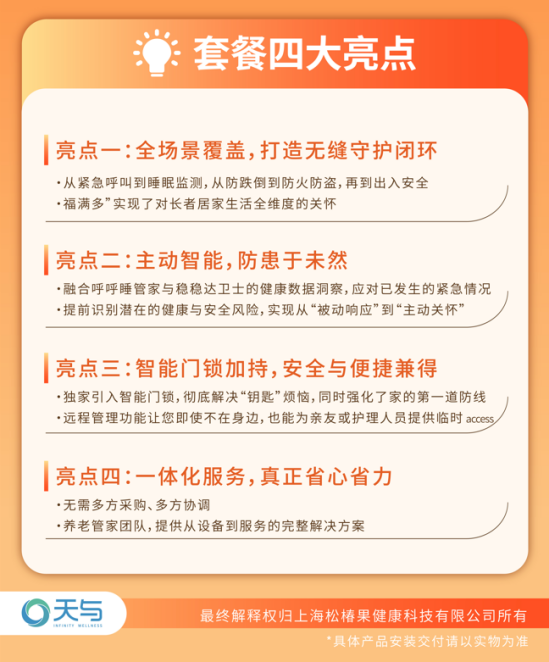 针对老人与子女的双重痛点,安全与尊严之间的矛盾,在硬件层面上的智慧升维后,天与推出了“家的安全感”居家安全套餐,构建了一套完备的居家养老守护体系。
