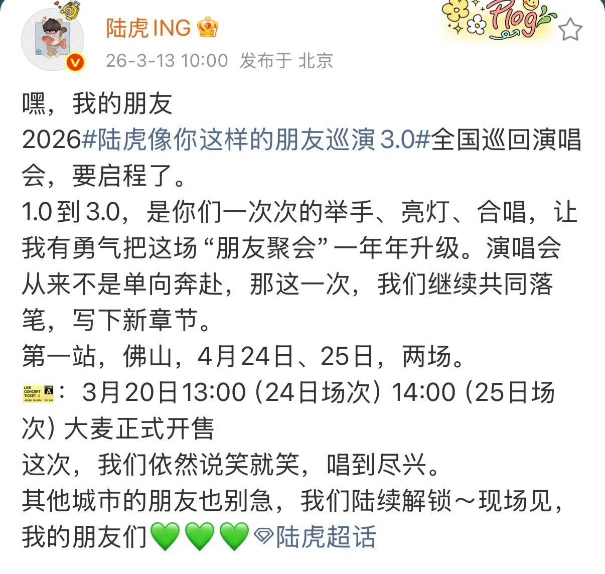 陆虎像你这样的朋友3.0演唱会官宣 第一站佛山,两场连开啦,虎子的事业运也是越来越好了! 4月24和25号连开两天,那一天陈楚生在南昌体育场! 这些年兄弟们真是节节高升,步子越来越大了! 快男和超女里唯一的排名最末也能混的风生水起的就是陆虎了! 综艺,导师,音乐节,演唱会, 就连短剧也演的出圈, 综艺嫡长子的名声在外, 陆虎真是一位幸运儿!陆虎再就业男团 陆虎