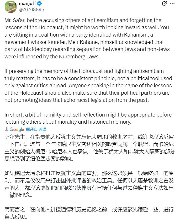 以色列外长萨尔又对克罗地亚不满:“克罗地亚总统的冒犯性言论令人无法接受。他对以色列和犹太复国主义充满仇恨的言论反映了一种反犹主义倾向。” 有人留言:犹太人应该谨言慎行。你不能用对待美国人的方式来对待欧洲和欧洲人。犹太人和犹太复国主义者试图用“反犹主义的胡说八道”来压制任何批判性思想和言论,但这在欧洲行不通。