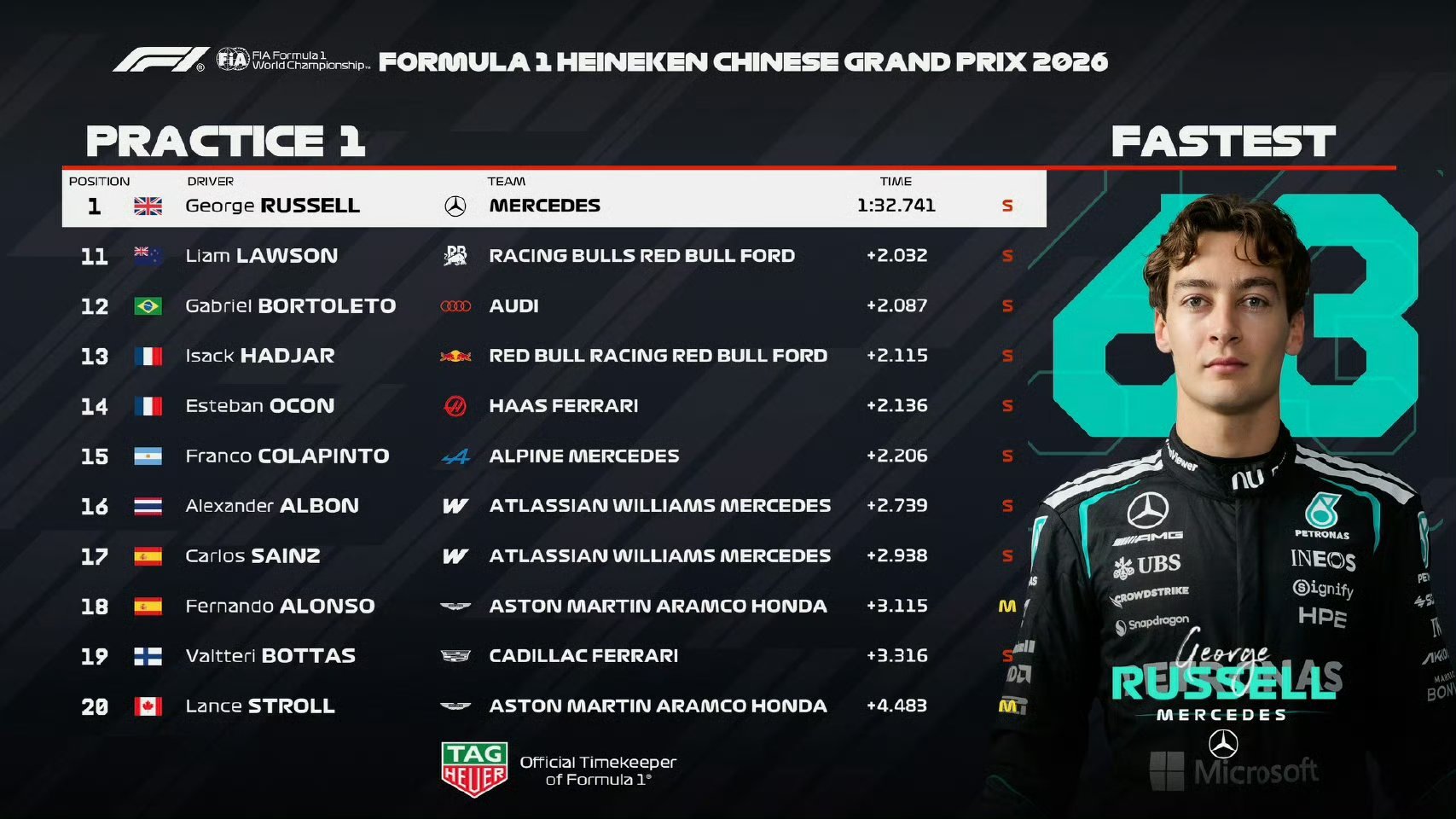 梅奔车队包揽练习赛前二练习赛战况出炉!拉塞尔软胎飞驰圈 1:32.741 拿下最快,强势领跑;安东内利以 1:32.861 紧随其后,仅差 0.120 秒。梅赛德斯双车包揽前二,状态火热!