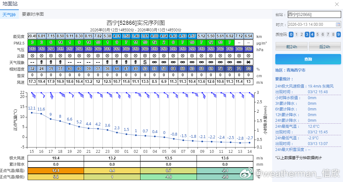 【气温波动】今天因为冷空气+阴雨雪遮挡光照,青海东部、甘肃西南部、内蒙古多地降温超10℃。甘肃夏河降20.7℃、合作降19.7℃、碌曲降19.3℃、青海瓦里关降19.3℃、内蒙古苏尼特右旗降17.8℃,排在14时降温榜前五。而且包括西宁、西安(泾河)等站点,气温出现倒降走势,下午比凌晨还低。