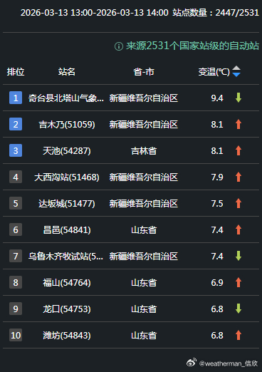 今天在冷空气过后,新疆开始升温。此外在冷空气到来前,山东以及东北三省多地气温也在回升。新疆奇台升9.4℃、吉林长白山天池升8.1℃、山东昌邑升7.4℃,为各自省区14时升温最强站点。明天山东和东北也会降温。今天在升温榜上的山东站点,明天有可能转而登上降温榜。