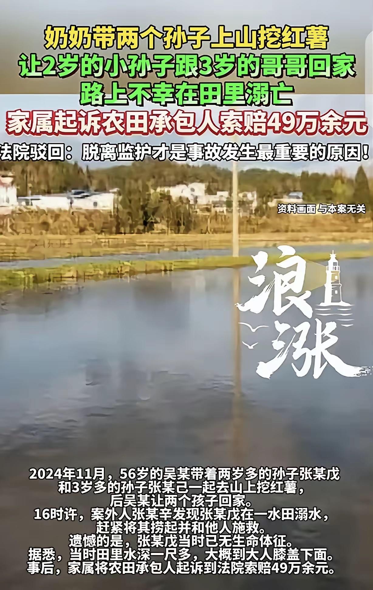 “悲剧还是发生了!”56岁女子,带着3岁和2岁的孙子上山挖红薯,然后让2岁的孙子跟着3岁哥哥回家,路上不幸在水深一尺多的田里溺亡,家属跟农田承包人索赔49万,法院驳回,认为脱离监护才是悲剧发生的原因,不料,家属不服,提起上诉,要求判决农田承包人承担10%的责任,赔偿9.9万。二审法院判决出乎意料。 可吴某怎么也不会料到,就是这一句随口的吩咐,酿成了无法挽回的悲剧。下午4点左右,同村村民张某辛路过村边一处农田时,突然发现水里漂着一个小小的身影,他心里一紧,赶紧冲过去,伸手将孩子捞了上来,等他把孩子抱上岸,才发现是吴某的小孙子张某戊,此时的孩子浑身湿透,已经没了呼吸,任凭他和随后赶来的村民怎么施救,都没能唤醒这个年幼的小生命。据张某辛回忆,当时那片田里的水深也就一尺多,刚到成年人的膝盖下面,可对于才2岁、连站都站不稳的孩子来说,这一尺多深的水,就是致命的深渊。 大家赶紧联系吴某和孩子的父母,当吴某赶到现场,看到躺在地上毫无生气的小孙子时,当场就瘫倒在地,哭得撕心裂肺,嘴里反复念叨着“是我不好,是我不该让他们自己回家”,可再多的忏悔,也换不回孩子鲜活的生命。悲痛过后,家属们把所有的怨气都撒到了农田承包人张某身上,他们认为,要是张某没有清理那片农田,田里就不会有积水,孩子也就不会溺水身亡,于是一纸诉状将张某告上法庭,索赔各项损失共计49万余元。 家属们的诉求很简单,就是让张某为孩子的死亡负责,可一审法院审理后,给出的判决却让他们难以接受。法院查明,这片农田是张某合法承包的山田,并非商场、公园那种对不特定公众开放的公共场所,张某本身就没有对所有人的安全保障义务。而且张某在2024年3月只是找人清理了田里的杂草和垃圾,并没有把农田挖深改成鱼塘,也没有改变农田的农业用途,事发时的积水,只是正常的田间积水,并非张某人为制造的危险隐患。 更关键的是,法院明确指出,2岁多的张某戊属于无民事行为能力人,他的父母和爷爷奶奶,是他的法定监护人,对他的安全负有第一位的责任,本该时刻看管、寸步不离,可吴某却擅自让他跟着年仅3岁、同样没有自我保护能力的哥哥独自回家,这种严重的监护失职,才是导致孩子溺亡的根本原因。除此之外,孩子出事之后,家属既没有及时报警,也没有对孩子进行尸检,连孩子确切的死亡原因都无法完全确认,在这种情况下,要求农田承包人承担责任,于法无据,最终一审法院驳回了家属的全部诉讼请求。 一审判决下来后,家属们始终无法接受这个结果,他们觉得,就算监护有失职,农田承包人也不能一点责任都没有。于是他们提起上诉,主动降低了索赔要求,只要求张某承担10%的责任,赔偿9.9万元,理由是张某清理农田后,没有设置任何警示标识,也没有采取防护措施,而且他们怀疑张某清理农田是想改成鱼塘,擅自改变农田用途,才留下了安全隐患,对孩子的死亡有一定的过错。 家属们满心期待二审法院能给出不一样的判决,可这份出乎意料的二审判决,却再次泼了他们一盆冷水——二审法院驳回了他们的上诉,维持了一审原判。二审法院认为,张某清理自家承包的农田,是合理利用土地的行为,没有超出农田的使用范围,也没有改变农田的农业用途,而且农田本身就是开放的生产区域,要求张某在农田周围设置警示标识、采取防护措施,显然超出了合理的义务范围,张某对孩子的溺亡,没有任何过错。 反观家属一方,作为孩子的监护人,疏于履行监护职责,放任年幼的孩子脱离看管,独自处于危险环境中,这才是悲剧发生的直接且主要原因,按照《民法典》侵权责任编的相关规定,监护人未尽到监护义务,导致被监护人遭受人身损害的,应当自行承担责任。更何况,家属主张张某擅自改变农田用途、存在安全隐患,却始终没能提供任何有效的证据,空口无凭,自然得不到法院的支持。 更值得警醒的是,现实生活中,类似的监护失职悲剧,其实还有很多。有的家长忙着玩手机,让孩子独自在路边玩耍;有的老人图省事,把年幼的孩子独自留在家里;还有的人抱有侥幸心理,觉得“就一会儿,不会出事”,可意外从来不会给人侥幸的机会。对于年幼的孩子来说,监护人就是他们的天,一旦这天塌了,意外就会趁虚而入。 这场悲剧给所有监护人都敲响了警钟:监护不是一句口号,而是沉甸甸的责任,容不得半点马虎、一丝懈怠。二审法院的判决,不是冷漠,而是用法律的方式,重申了一个道理——谁的责任,就该谁来担,监护失职的苦果,终究要自己咽下去。 各位读者你们怎么看?欢迎在评论区讨论。
