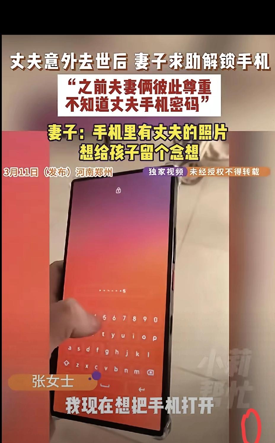 思念再深,也抵不过对一个人最后的尊重。郑州这位女子在丈夫离世后,只想解开旧手机,留下照片给孩子当作念想,却被密码和高额费用拦住,进退两难。 他们生前从不互看手机,是信任,也是留给彼此的体面。如今一方离去,这份体面更不该被打破。很多人劝她别强行解锁,不是冷漠,而是怕打破回忆里的干净。真正的爱,不是挖开所有隐私,而是守住对方最后的空间。 照片只是载体,藏在日常里的陪伴与温柔,才是留给孩子最好的遗产。思念有很多方式,不打扰,也是一种深情。 你觉得,逝去之人的隐私,该不该被彻底打开?