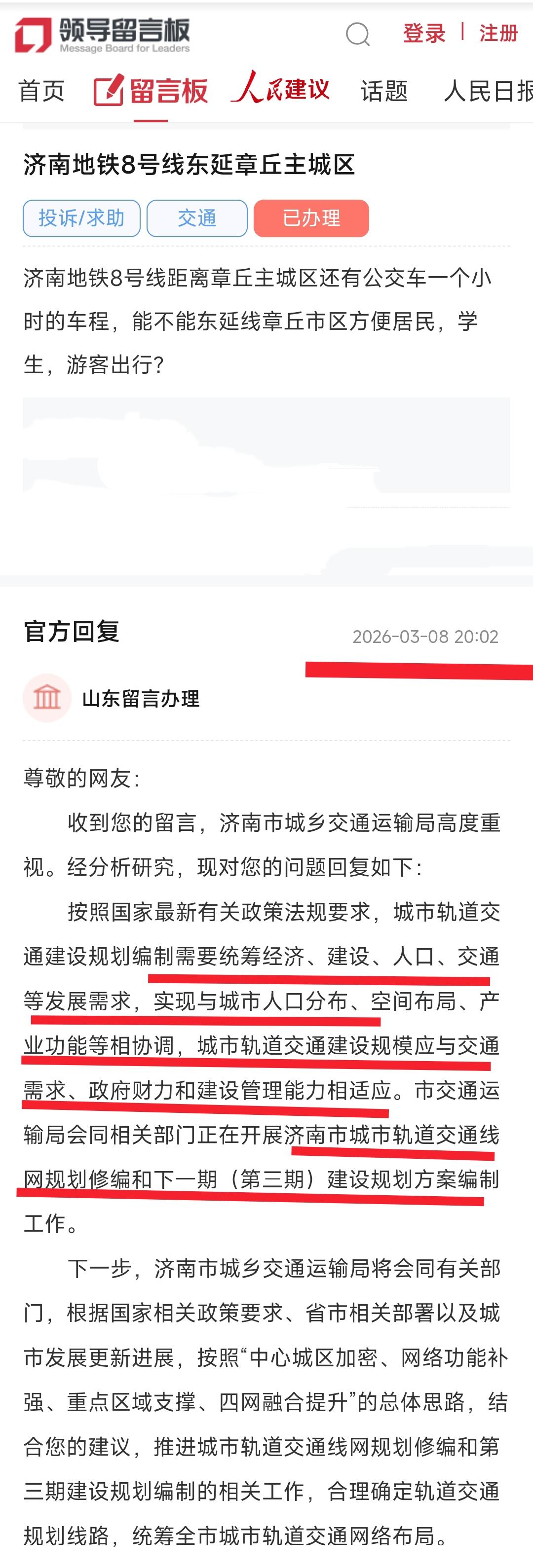 转眼间济南地铁8号线开通有好几个月了,不过对于章丘区的百姓来说意犹未尽,因此最近有热心市民询问济南地铁8号线何时能继续往东部延伸至章丘区人流量密集的区域呢? 从3月8日的回复看济南正在规划第三期地铁,因此济南地铁8号线想要继续延伸到章丘市区只能寄希望于这条地铁线路能纳入三期规划,并且今后能够顺利获得批复。 只有这样章丘区核心地段才能实现地铁梦,经十东路沿线才能发展越来越好,让我们拭目以待。