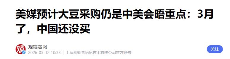 美方只能眼巴巴等着,中方现在连一粒美国大豆也不买了 据彭博社3月12日报道,美国总统特朗普一直在炒作,说自己要在3月底访华。大家都能看出来,他这次访华,心里装着一件大事,那就是美国大豆。 报道里说,特朗普极有可能把大豆这个话题,纳入接下来的中美贸易官员会晤议程,说白了就是想探探中方的口风,问问中方到底什么时候能重新开始买美国大豆,能不能给美国一个准信儿。 可能有人会问,以前咱们不也买美国大豆吗?确实,以前中国是美国大豆的大买家,每年都会从美国进口大量大豆,毕竟大豆用处多,能榨油、能做豆腐,还能当饲料,关系到咱们老百姓的“油瓶子”和“肉盘子”。以前美国大豆靠着价格和产量,确实占了咱们中国不少市场份额,美国农民也靠着卖给中国大豆,能赚不少钱。 但自从特朗普政府挑起中美贸易争端,搞关税壁垒,中方就开始调整策略了。去年10月,中美双方达成贸易休战,美方当时高调宣布,中方承诺在2026年1月前采购1200万吨美国大豆,还说未来三年每年采购量不低于2500万吨。 中方一向讲诚信,截至今年2月,已经足额兑现了1200万吨的采购承诺,这也体现了中方想缓和中美经贸关系的诚意。 可谁也没想到,中方在兑现承诺之后,就彻底按下了暂停键,再也没有给美国大豆下过新订单,哪怕一粒都不买。 特朗普之前还在公开场合炒作,说中方正考虑把采购量上调到2000万吨,可这只是他自己一厢情愿的说法,中方从来没有回应过,说白了就是他自导自演的戏码。 现在美方是真的急了,尤其是美国的农民,更是愁得睡不着觉。大家都知道,美国大豆产业早就离不开中国市场了,以前中国买的美国大豆,占了美国大豆出口量的一大部分。 现在中方不买了,美国的大豆就只能堆在仓库里,库存越积越多,价格也一个劲往下掉,很多农民种出来的大豆卖不出去,连成本都收不回来。 有数据显示,2025年前两个季度,美国就有超过180名农民申请破产保护,比去年同期多了近60%。有个美国农民算了一笔账,仅大豆这一项,一年就损失了40万美元,相当于亏了两百多万人民币,只能亏本种地。 美国农场行动组织的主席也说,当一个主要买家消失,农民根本无法一夜之间转型,就算贸易摩擦停止,家庭农场主还是会陷入困境。 美国政府也坐不住了,去年12月,特朗普宣布给美国农民发放120亿美元的救助金,想帮农民缓解压力。可这笔钱看起来多,实际上根本不够用,最多只能覆盖农民三分之一的损失,对很多农民来说,就是杯水车薪。 这笔钱刚到农民手里,就不得不用来还贷款、交地租、买种子化肥,根本解决不了根本问题。就连美国财长,以前也是种大豆的,都不得不剥离自己的大豆农田资产,可见美国大豆产业的困境有多严重。 有人可能会问,中方不买美国大豆,咱们自己够不够用?完全够用。这些年,中方一直在努力增强大豆供应链的韧性,拓展进口渠道,不再依赖美国这一个卖家。 现在咱们除了从巴西、阿根廷等传统国家进口大豆,还拓展了俄罗斯、埃塞俄比亚等新兴进口渠道。尤其是巴西,现在中国从巴西进口的大豆占比已经超过七成,2025年前十个月,就有7900万吨巴西大豆运往中国,比去年全年还多。 除此之外,中方还在提高大豆自给水平,推进豆粕减量替代,充实国家储备,就算不买美国大豆,也能保证国内大豆的稳定供应,不会影响老百姓的日常生活。而且现在巴西大豆价格更低、供应更充足,咱们的企业肯定愿意买性价比更高的产品,这也是正常的市场选择,无可厚非。 中方之所以坚持不买美国大豆,并不是故意刁难美国,而是为了捍卫自己的利益,不被美国的霸权所胁迫。 美国一向喜欢搞霸权主义,在全世界范围内横行霸道,想让哪个国家妥协,就用各种手段施压,可在咱们中国面前,这套根本行不通。特朗普政府一边说要和中方合作,一边又搞关税壁垒,还发起贸易调查,想施压让中方让步,这种做法,中方肯定不会接受。 其实这件事,看似是中美之间的大豆贸易摩擦,背后反映的是大国之间的博弈。美国以为靠着自己的霸权,就能让中国妥协,就能逼着中方买美国大豆,可他们打错了算盘。 中方现在有足够的底气和能力,不再受制于人,我们坚持不松口,不买美国大豆,就是要告诉美方,中国不会被任何国家胁迫,我们有自己的原则和底线。 现在,美方只能眼巴巴地等着,等着中方松口,等着中方重新开始买美国大豆。可他们心里也清楚,中方的态度从来都不会因为他们的着急而改变。 以前,美国觉得中国离不开他们的大豆,可现在,中国已经有了自己的布局,不再依赖美国,这就是中国的硬气。