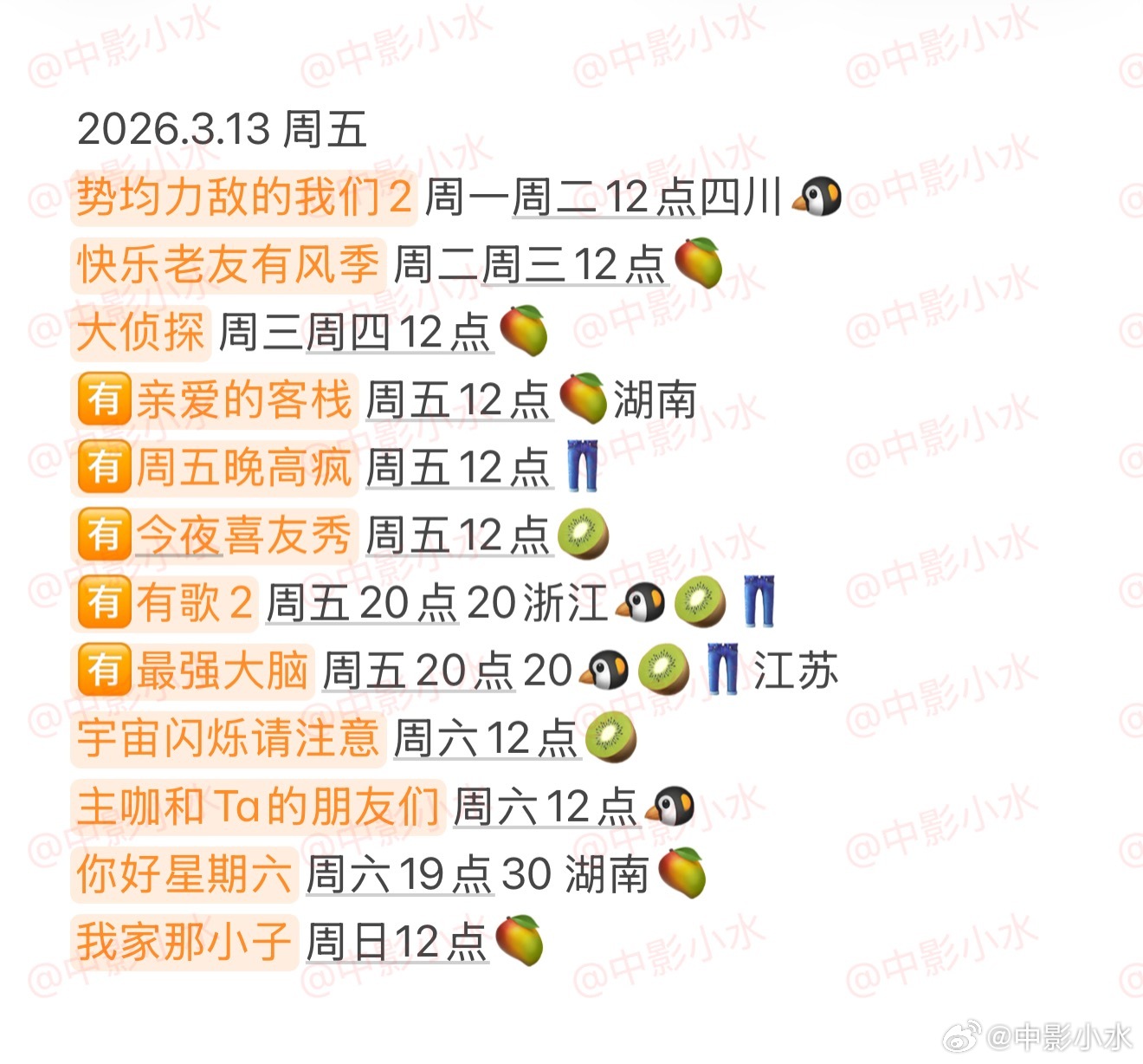 🈶亲爱的客栈 🈶周五晚高疯 🈶今夜喜友秀 🈶有歌2 🈶最强大脑