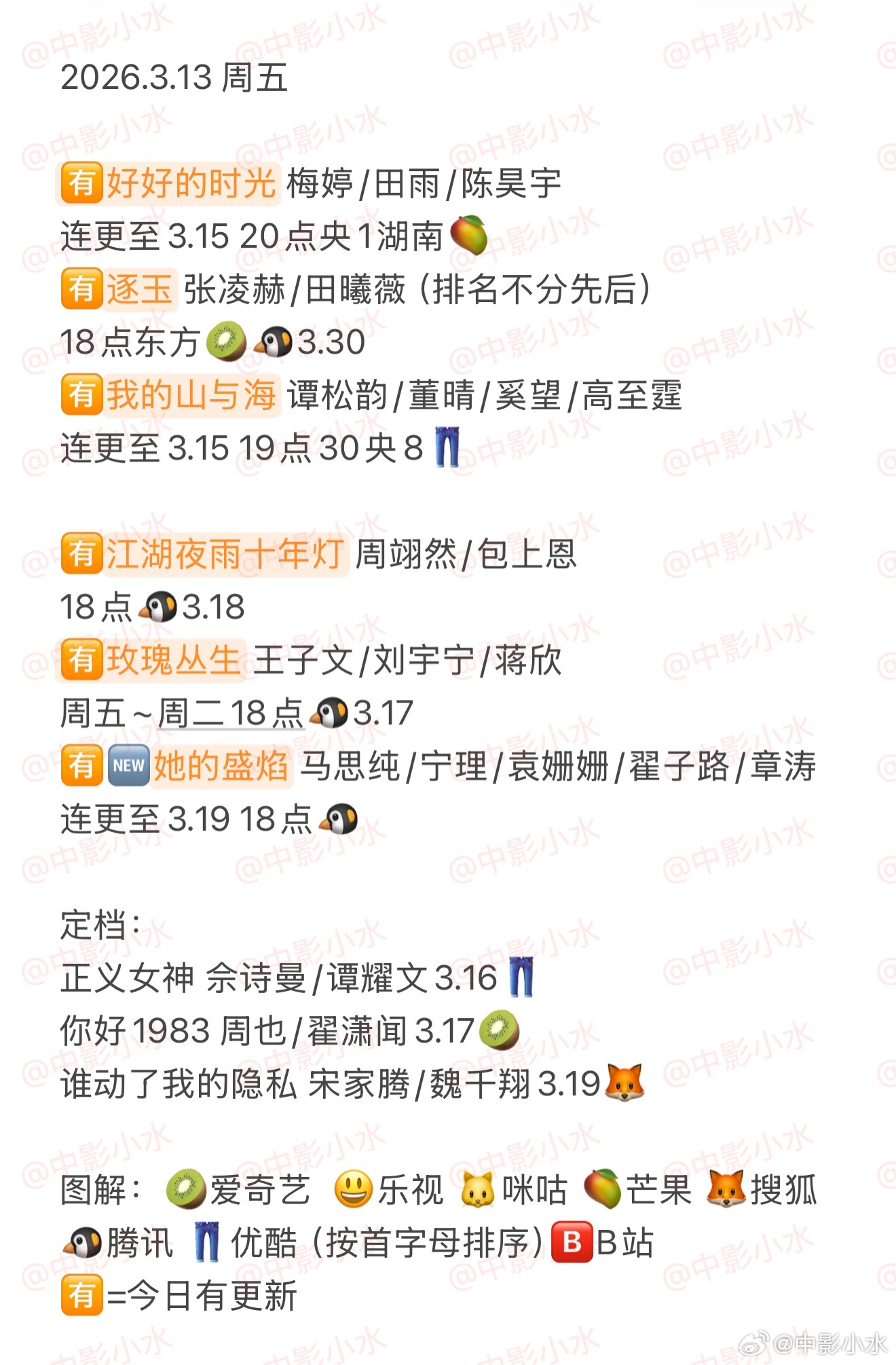 拯救剧荒 3月13日,今晚看点啥??图1 追剧日历 图2 综艺日历 图3 已完结剧集 🈶好好的时光 梅婷/田雨/陈昊宇🈶逐玉 张凌赫/田曦薇(排名不分先后)🈶我的山与海 谭松韵/董晴/奚望/高至霆