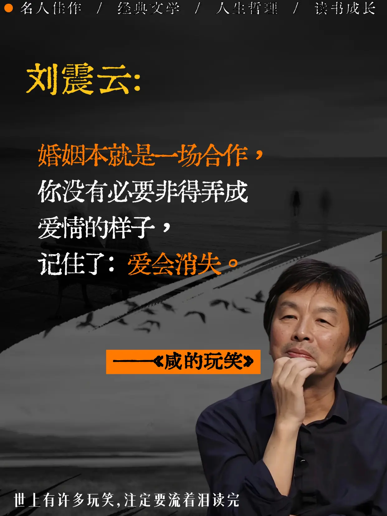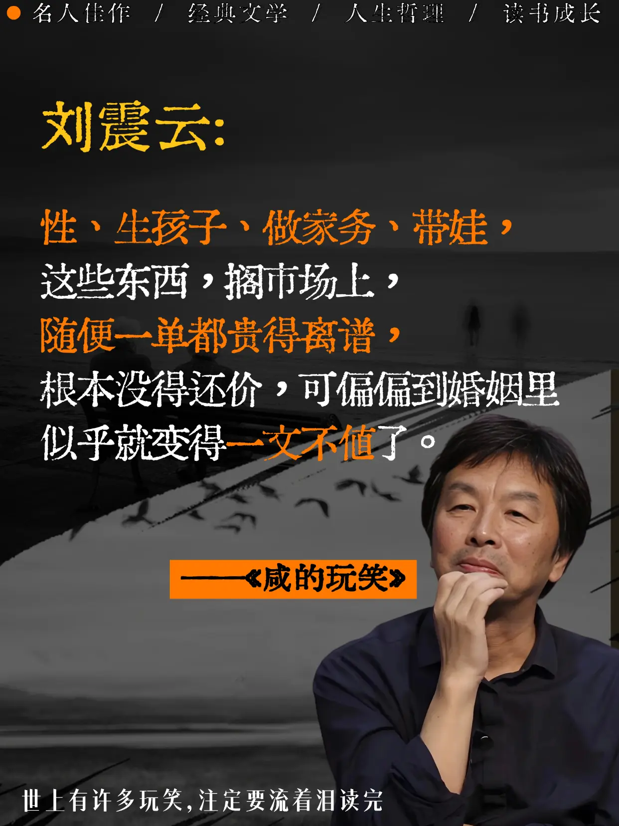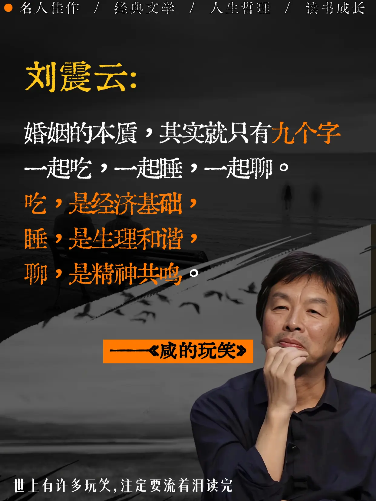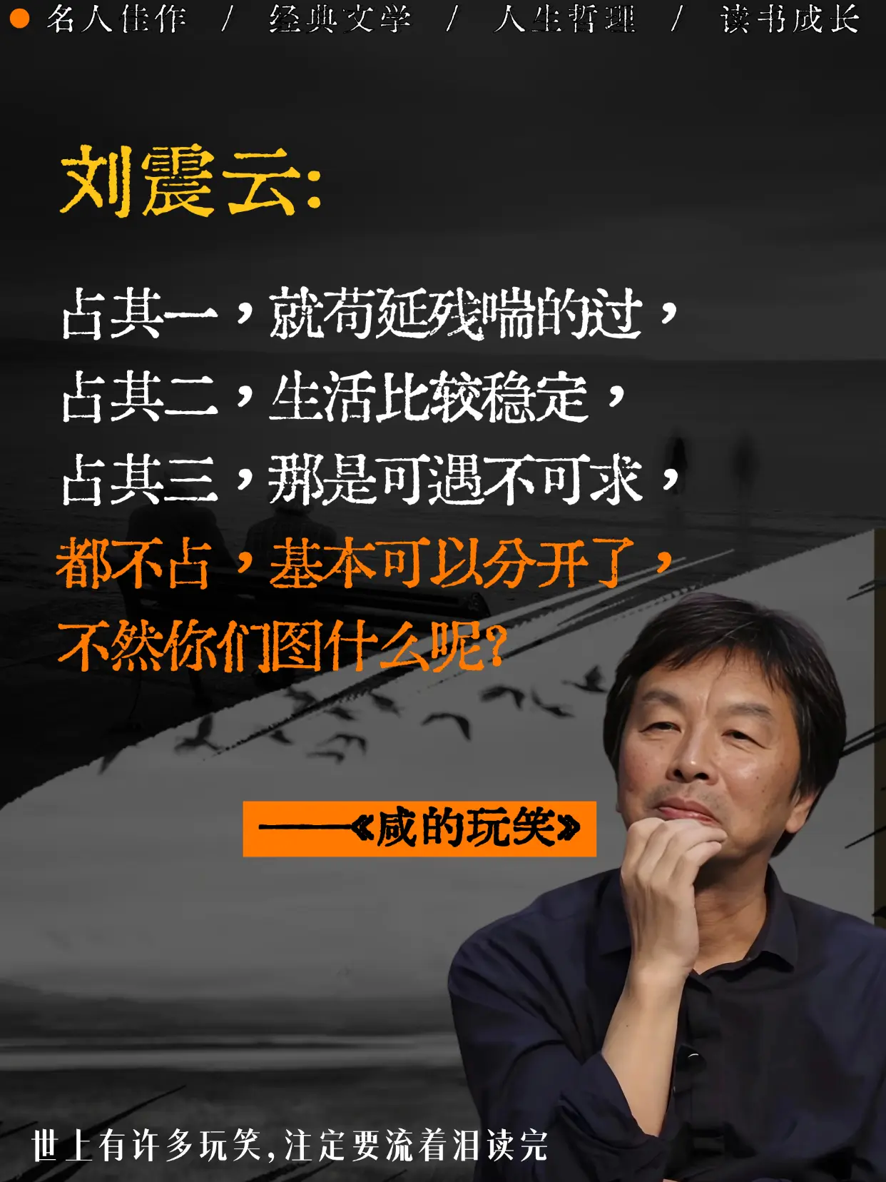 不愧是刘震云老师,新书太太太扎心了。跨别四年后刘震云老师新作,简直不要太真实,他把成年人的崩溃与体面,都写成了一个个带着咸味的玩笑。原来我们的人生,不过是一场流着泪也要讲完的笑话。