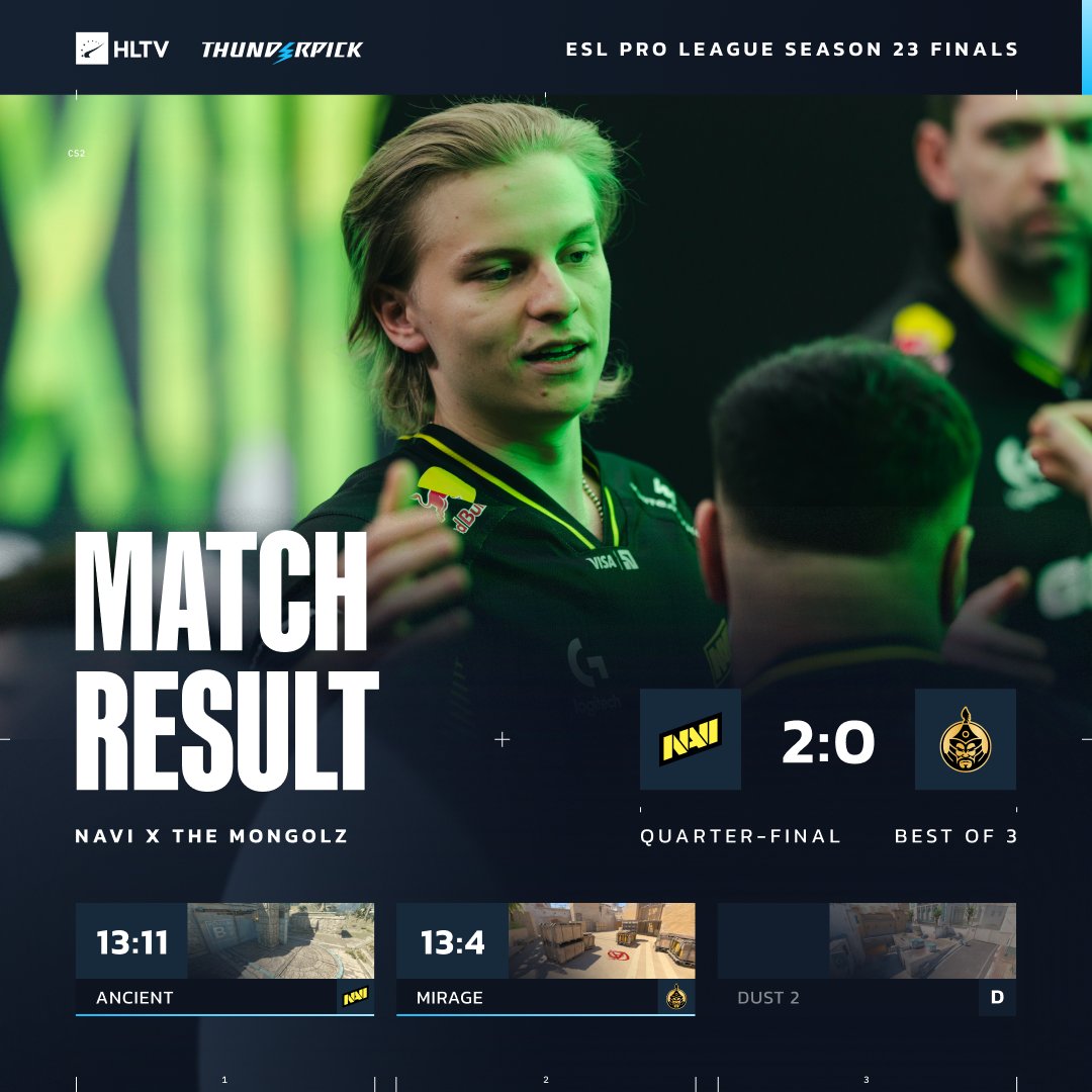 虎扑03月13日讯EPLS23四分之一决赛首场:NAVI对阵TheMongolZ。