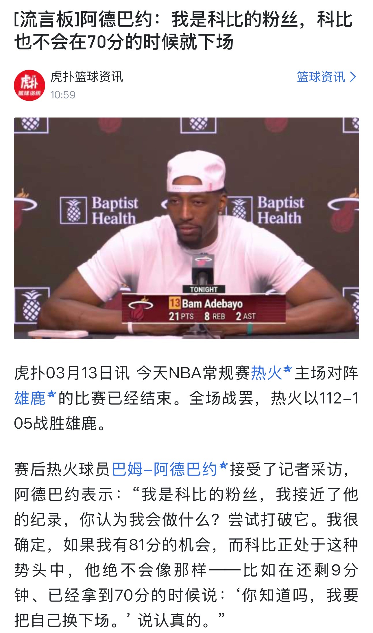 因为超越了原本被认为不会被超越的81分,阿德巴约这位资深科比球迷成为了被攻击和网