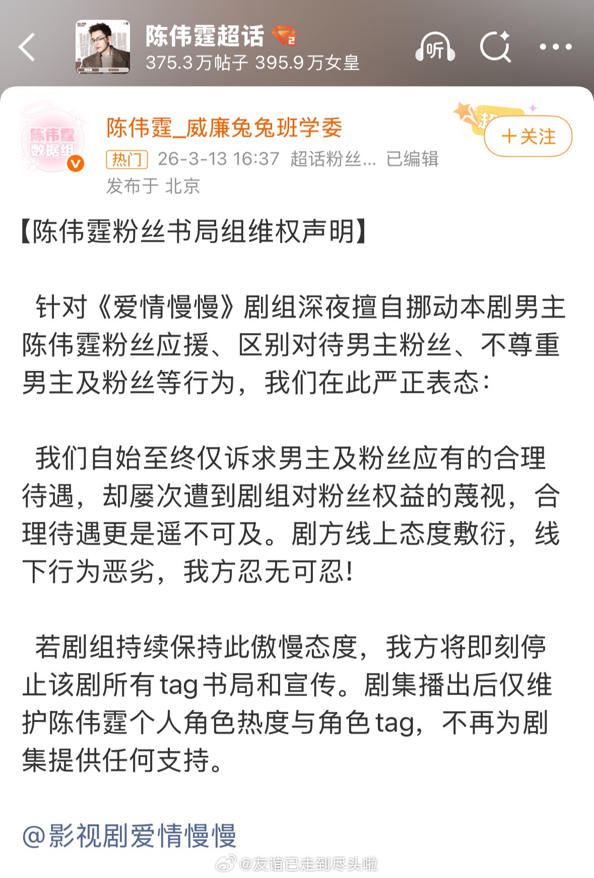 陈伟霆书局组发文质问《爱情慢慢》剧组,说剧组深夜挪动甚至置弃男主粉丝应援物料、区别对待男主粉丝