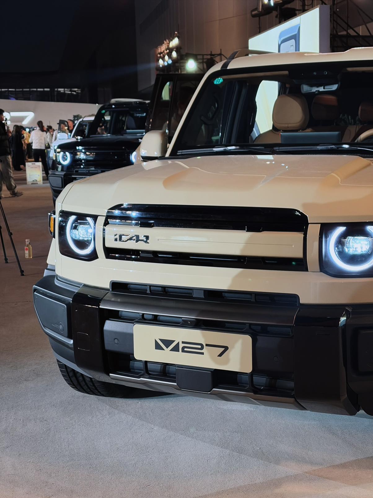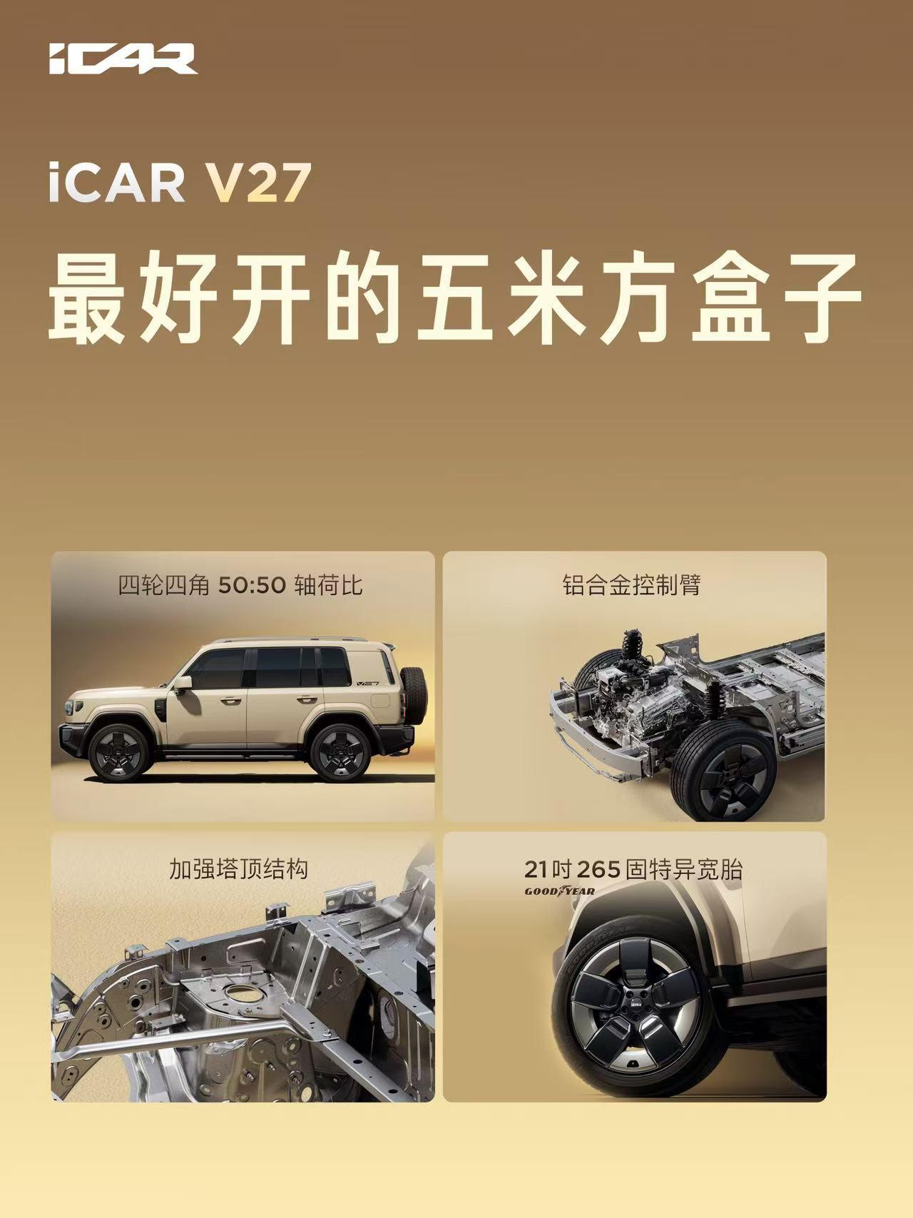 iCar V27 16.98万起售,好看好开的5米方盒子 以Born To Play为Slogan的iCar给出了大五座5米级方盒子iCar V27。顶配版搭载地平线J6M芯片和禾赛激光雷达,猎鹰700 HSD智驾方案,支持城市NOA。中底配搭载猎鹰500,支持高速NOA,记忆泊车(具体见下文) 要我说iCar V27最吸引人的还是他的造型,真的很好看,尤其是加上复古的色彩,这是一台可以加油的增程车。纯电的能跑200公里,底盘采用更适合越野的机械弹簧和可变阻尼减震器能够提供更好开的公路质感。在越野上,他们开V27成功挑战了沙漠穿越。 座舱很流畅,支持CarPlay和oppo vivo小米的手机上车,还支持大模型以及Deepseek为语音助手。 • 猎鹰500 ◦ 纯视觉方案,无激光雷达 ◦ 传感器:约22个(摄像头+毫米波+超声波) ◦ 算力:约100TOPS ◦ 功能:高速NOA、基础城区NOA、记忆泊车 • 猎鹰700 ◦ 激光雷达+视觉融合(禾赛ATX) ◦ 传感器:27–30个(含1颗激光雷达) ◦ 算力:560TOPS(地平线征程6P) ◦ 功能:全场景NOA(高速+城区)、代客泊车、车位到车位、130km/h AEB/AES【来自懂车帝车友圈】