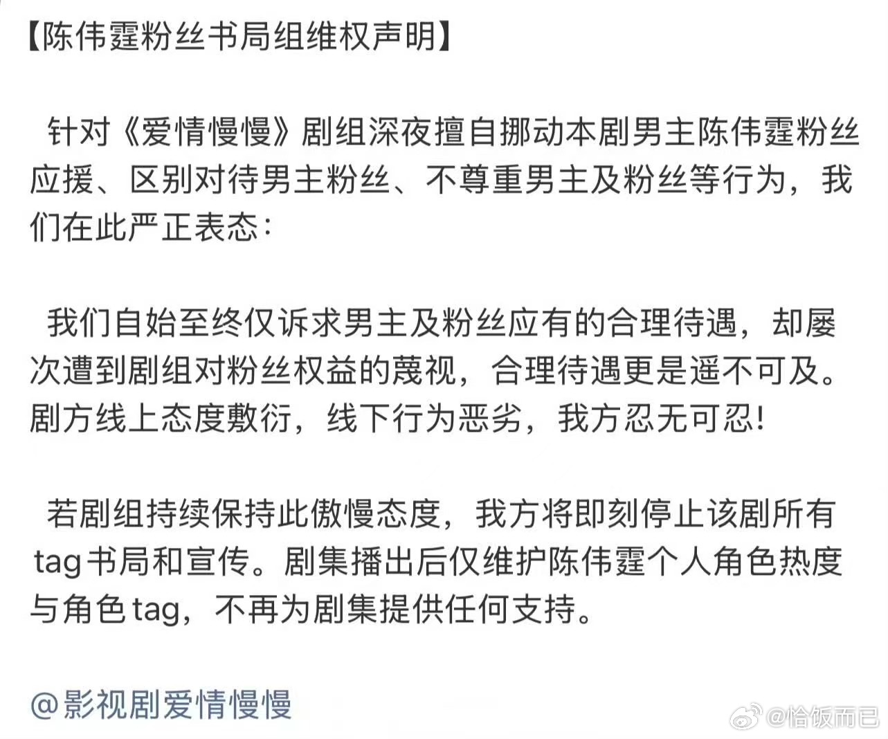 陈伟霆粉丝关于《爱情慢慢》维权声明剧组关于男主区别对待 对于粉丝的诉求由始至终也是敷衍毫不作为如若剧方继续,陈伟霆粉丝将不再支持该剧仅维护陈伟霆个人角色及热度