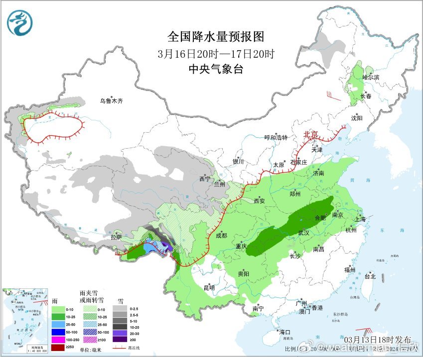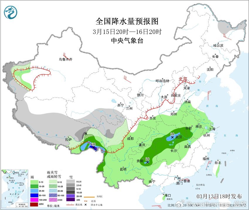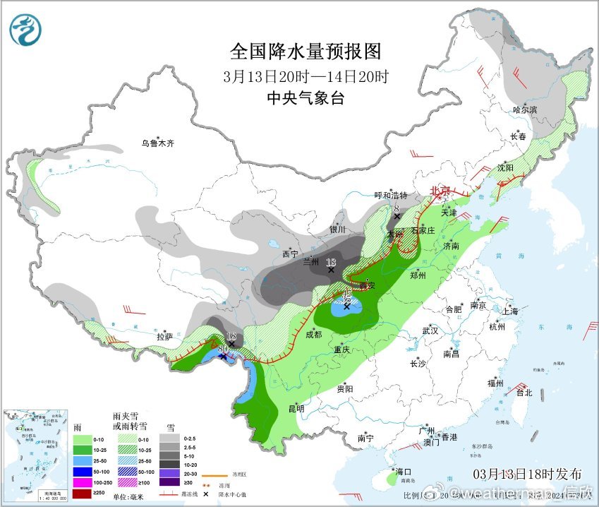 【雨雪】昨晚到今天,从云南到内蒙古多地,降水增多。今晚到明天,冷暖空气继续交汇,我国还有大范围雨雪,而且强度较强。预计3月13日20时至3月14日20时,西藏东南部、云南西部、陕西中南部、山西南部、河南西部、四川东北部、重庆北部等地部分地区有中到大雨,其中,西藏东南部局部地区有暴雨(50~80毫米)。