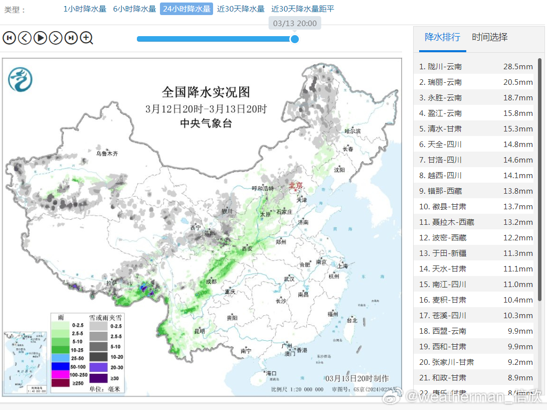 预计3月13日20时至3月14日20时,青海东部、川西高原北部、甘肃东部和南部、宁夏南部、陕北南部和秦巴山区、山西中部以及西藏东部等地有大雪,其中,甘肃东部、宁夏南部、秦巴山区、西藏东部等地部分地区有暴雪(10~18毫米)。上述部分地区新增积雪深度5~10厘米,局地可达15厘米以上。中央气象台继续发布暴雪蓝色预警。