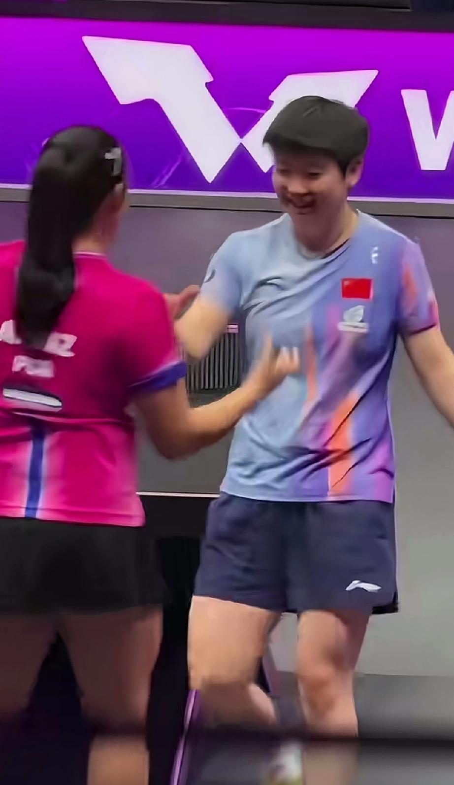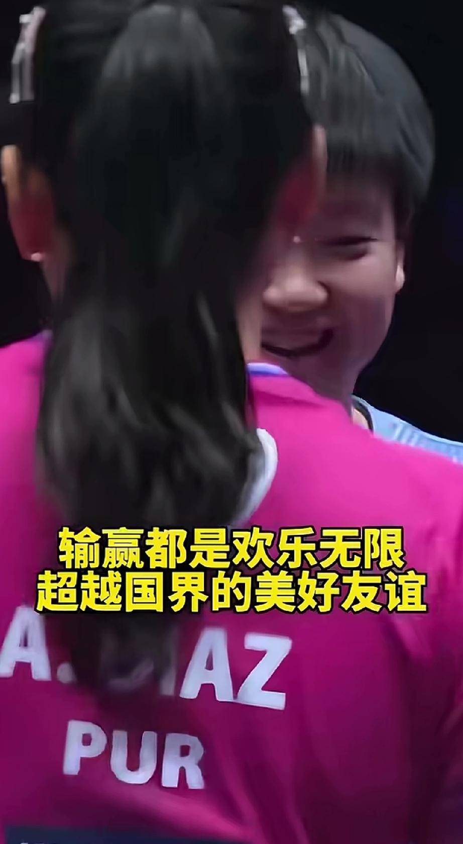 在好朋友面前,莎莎赢了都不好意思。太可爱了。 要说外协中,莎莎最出名的好盆友,迪亚茨算一个。网上有句名言,莎莎如果是男生,迪亚茨都有八个孩子了。 这不,重庆冠军赛,俩人遇上了,赛场上小魔王不减威力,认真对待每一个球。3:0战胜迪亚茨晋级八强。结束比赛立马笑脸出来,不好意思的用手擦擦球台。俩人拥抱在一起。 哈哈,比赛是比赛,一点不耽误俩人的友谊。真好!这样的好朋友,可以给莎莎来一打,都喜欢。