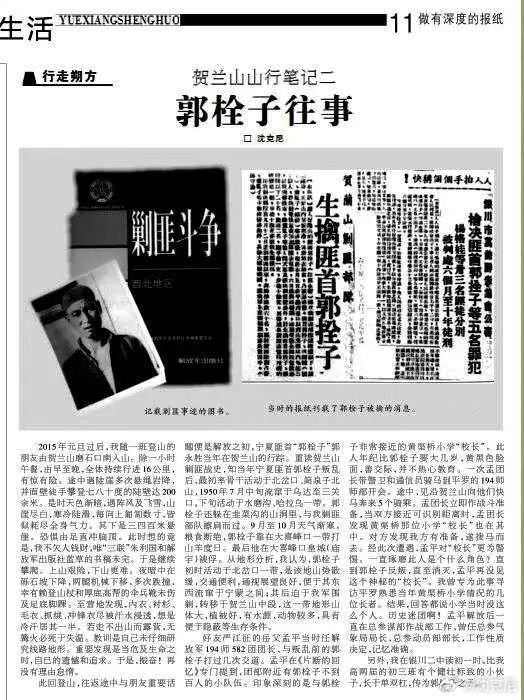 今日沙尘天气伴风雪,宁夏电视台邀约我访谈。主要两个问题: 1、我军解放宁夏时,贺兰山潮湖村两位剿匪牺牲烈士为什么不知姓名?我回答,这两位解放军战士为当地群众掩埋,不知战士所着五O式军服胸章(图2)背后有姓名部别职务的记录。因而姓名长期湮灭。 2、试从贺兰山地形角度讲述解放之初,我65军如何捕歼宁夏匪首“郭栓子”? 我答:当年宁夏匪首郭栓子叛乱后,最初率骨干活动于贺兰山北岔口(图4)、简泉子北山,1950年7月中旬流窜于乌达至三关口,下旬活动于水磨沟、哈拉乌一带。郭还躲在韭菜沟的山洞里,与我剿匪部队擦肩而过。9月至10月天气渐寒,粮食断绝,郭靠在大喜峰口一带打山羊度日。最后在大喜峰口皇城(庙宇)被俘。从地形分析,我认为,郭栓子初时活动于北岔口一带,是该地山势散缓,交通便利,通视展望良好,便于其东西流窜于宁蒙之间;其后廹于我军围剿,转移于贺兰山中段,这一带地形山体大,植被好,.有水源,动物较多,具有便于隐蔽等生存条件。 我的好友严江征的岳父孟平(图5)当时任解放军194师582团团长,与叛乱前的郭栓子打过几次交道。孟平将军在《片断的回忆》(图6)专门提到,团部附近有郭栓子不到百人的小队伍。印象印刻的是与郭栓子非常接近的黄渠桥小学"校长"。此人年纪比郭栓子要大几岁,黄黑色脸面,善交际,并不热心教育。一次孟团长带警卫和通信员骑马到平罗的194师师部开会。途中,见沿贺兰山向他们快马奔来5个骑乘。孟团长立即作战斗准备,当双方接近可识别距离时,孟团长发现黄渠桥那位小学"校长"也在其中。对方发我方有准备,遂拨马而去。经此次遭遇,孟平对"校长"更为警惕。一直琢磨此人是个什么角色?直到郭栓子反叛,直至消灭,孟平再没见这个神秘的"校长"。我曾专为此事寻访平罗熟悉当年黄渠桥小学情况的几位长者。结果,回答都说小学当时没这么个人。历史迷团啊!孟平解放后一直在总参谋部作战部工作,曾任总参气象局局长,总参动员部部长,工作性质决定,记忆准确。 另外,我在银川二中读初一时,比我高两届的初三班有个健壮标致的小伙子,长于单双杠,传为郭栓子之子。
