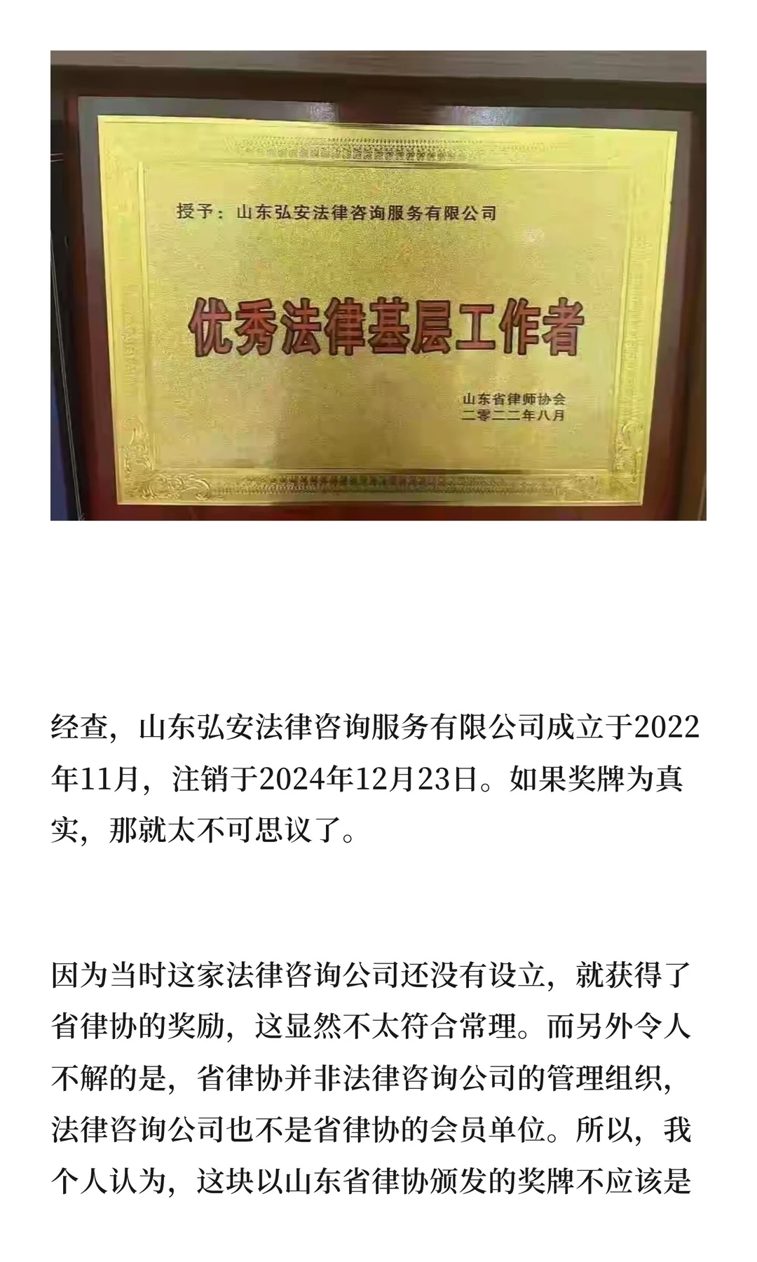 经查,山东弘安法律咨询服务有限公司成立于2022年11月,注销于2024年12月23日。如果奖牌为真实,那就太不可思议了。