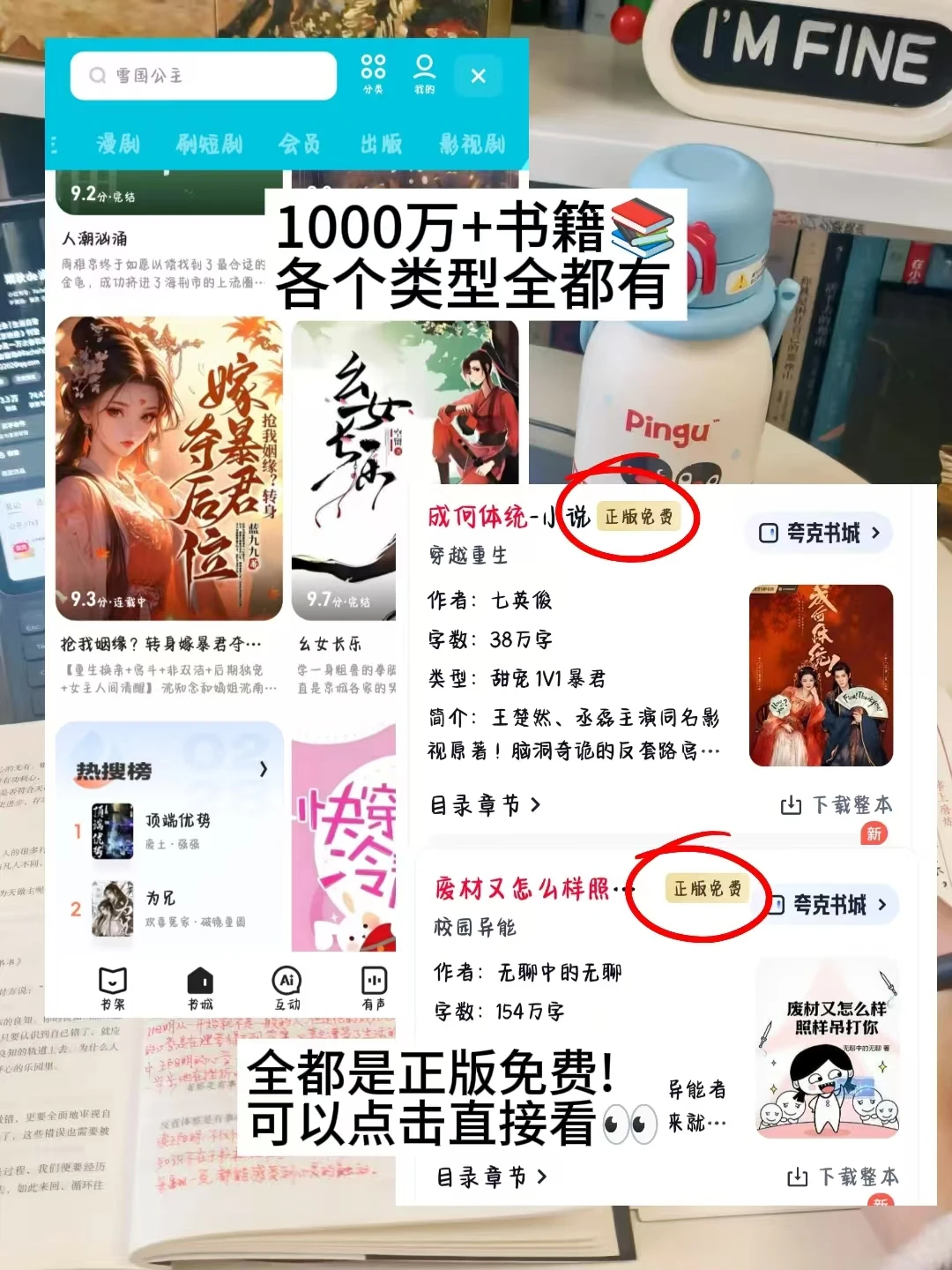 以前在某App追到高潮处,老是突然弹窗"解锁需0.3元",特别讨厌这种被打断的感觉,用了夸克发现它不仅1000万+正版书全免费,而且页面干净无广告,省心又省钱。且只要在夸克首页搜索框搜索关键词就能精准推到你想要的书,每天省下20分钟找书时间,一年多出的阅读时长,足够读完十几本书。