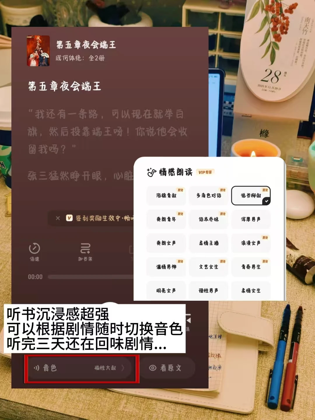 更意外的是AI听书的沉浸感——不是机械合成的电子音,而是能随意切换的真人质感音色,让眼睛休息时故事也不停,现在我已经养成了习惯,每天通勤或睡前都会打开夸克小说,它就是我向内求、重建精神秩序的一个锚点。听书时候闭上眼沉浸,让多音色朗读带着剧情在耳边流淌,让外在的喧嚣与内在的宁静相遇,让被短视频切割的注意力重新得到丰沃的滋养。