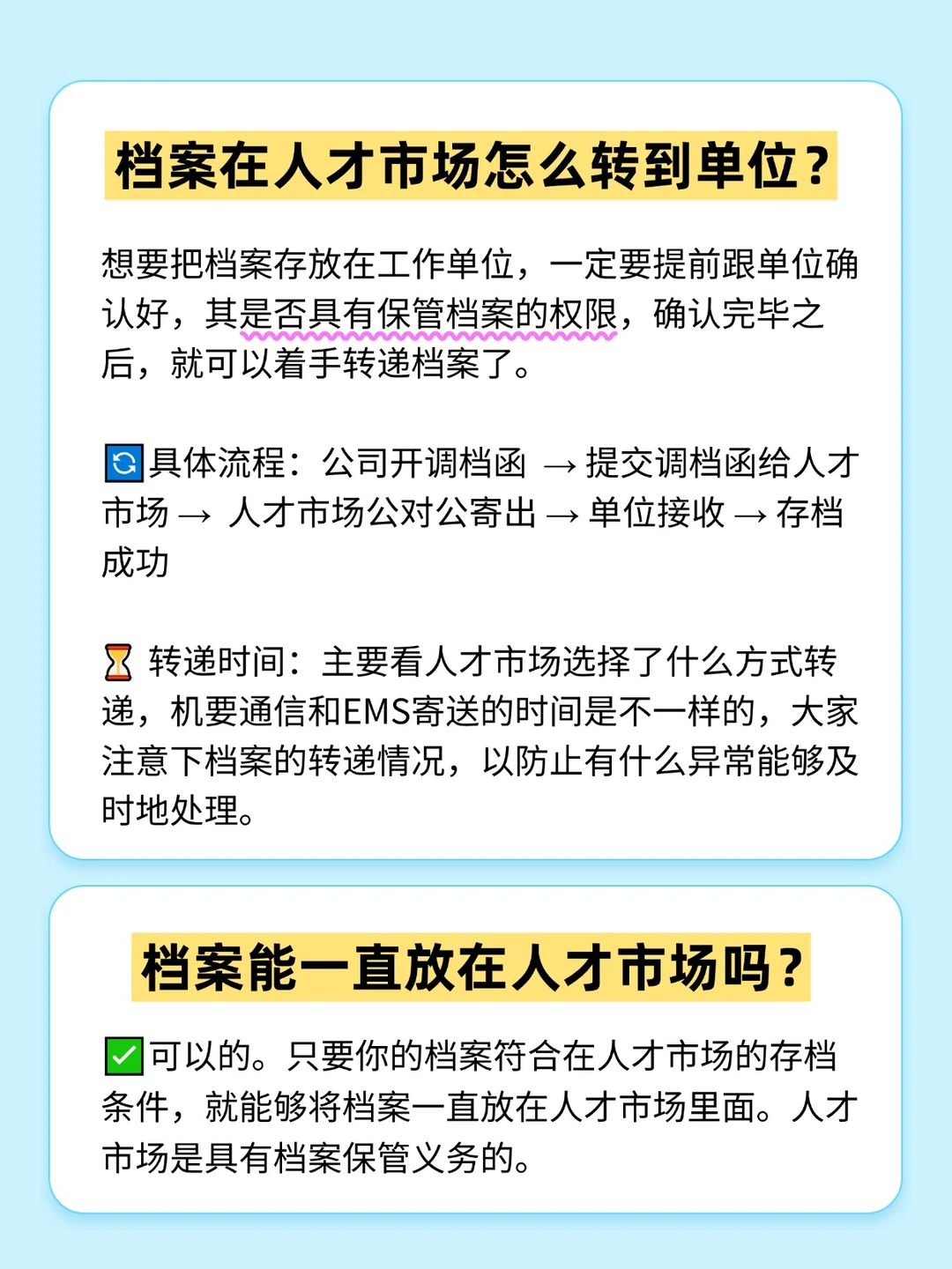 档案可以存放在人才市场、也可以存放在人社局,只要是具有档案保管权限的单位或机构,都是可以放心存放的。那有朋友提问:档案在人才市场要如何转到单位存放呢? 📍档案在人才市场怎么转到单位? 想要把档案存放在工作单位,一定要提前跟单位确认好,其是否具有保管档案的权限,确认完毕之后,就可以着手转递档案了。 🔄具体流程:公司开调档函 → 提交调档函给人才市场 → 人才市场公对公寄出 → 单位接收 → 存档成功 自己没时间去人才提交调档函,可以找专业的档案服务机构帮你。自己不用来回奔波 ⏳转递时间:主要看人才市场选择了什么方式转递,机要通信和EMS寄送的时间是不一样的,大家注意下档案的转递情况,以防止有什么异常能够及时地处理。 档案能一直放在人才市场吗? ✅可以的。只要你的档案符合在人才市场的存档条件,就能够将档案一直放在人才市场里面。人才市场是具有档案保管义务的。 大家存放好自己的档案之后,可以查询一下自己的档案状态,若是有什么不对劲的地方,也好处理