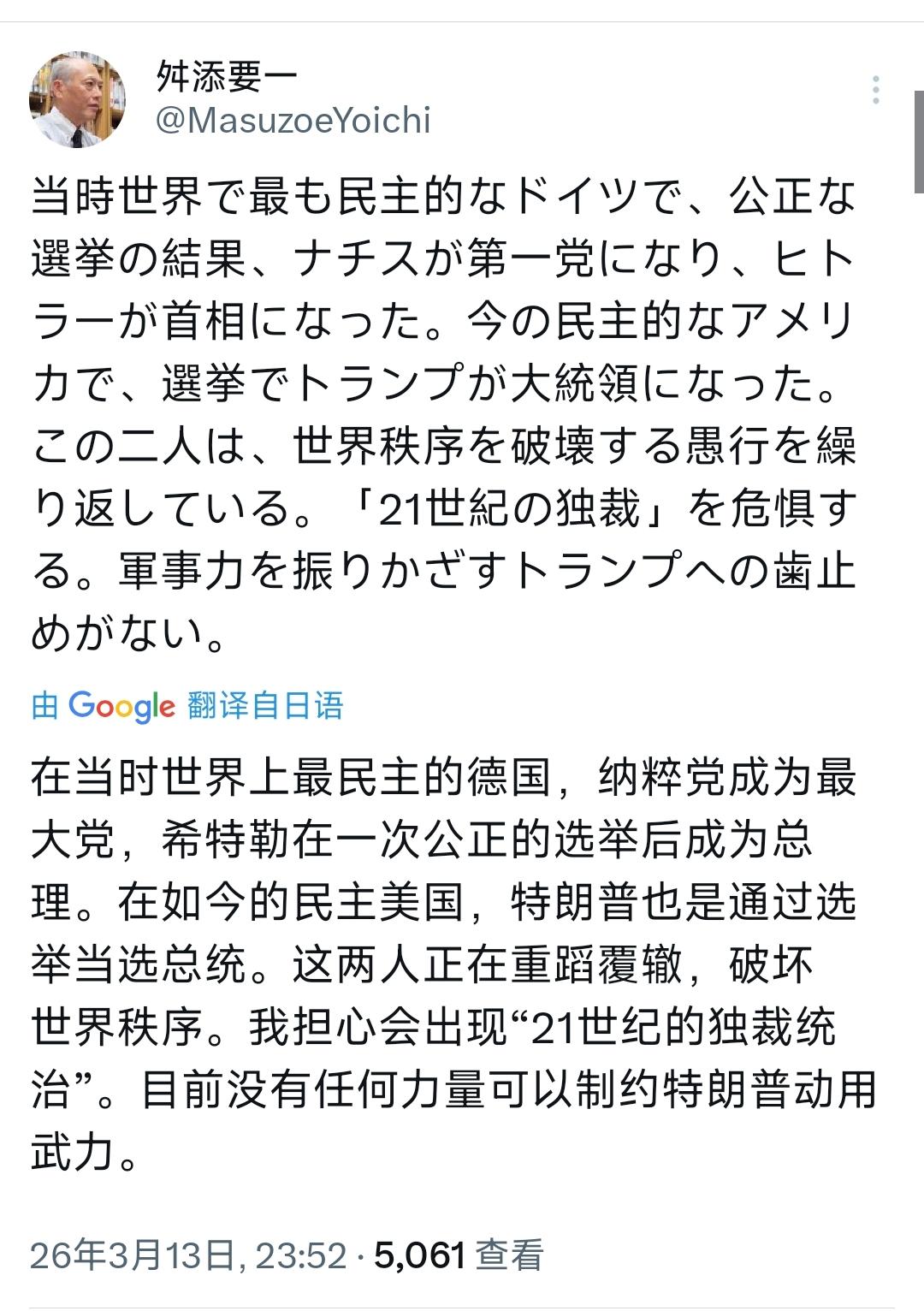 日本前东京都知事、前厚生劳动省大臣舛添要一昨晚(3月13日晚)写道:“在当时世界上最民主的德国,经公正选举,纳粹成为第一大党,希特勒就任首相。如今在标榜民主的美国,特朗普也通过选举当选总统。这两人正重蹈覆辙,做出破坏世界秩序的蠢事。我担心会出现‘21世纪的独裁统治’。目前没有任何力量可以制约特朗普动用武力。” [机智]评几句:舛添要一的直言可谓戳中了美式民主的致命病灶,民主的外壳从来都挡不住权力独大的野心,昔日德国以公正选举为跳板滋生独裁,如今特朗普借美式民主程序登顶,却将总统权力凌驾于司法与国会之上,肆意突破规则、动辄以武力相胁,让美国成为破坏世界秩序的最大变量,这样的发展轨迹与历史的危险走向何其相似。更讽刺的是,这种借民主之名行独断之实的行径并非美国独有,日本的高市早苗亦是如此,背靠美国霸权一味迎合,将日本绑上军国主义死灰复燃的战车,以所谓“自主”之名行盲从之实,同样是打着正当旗号的危险冒进。