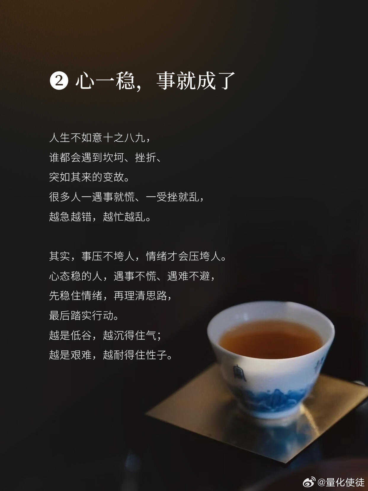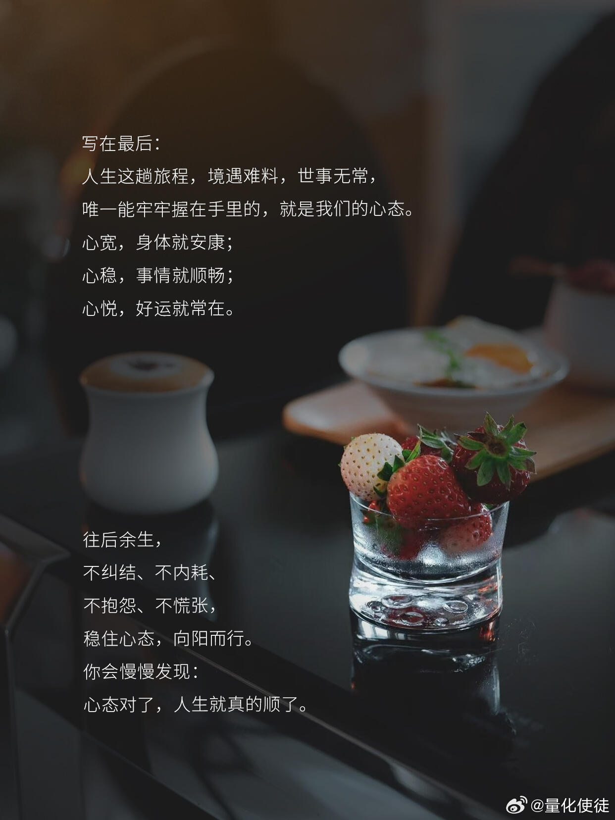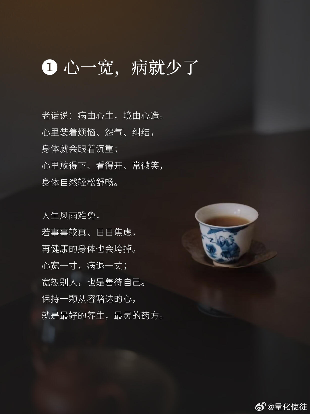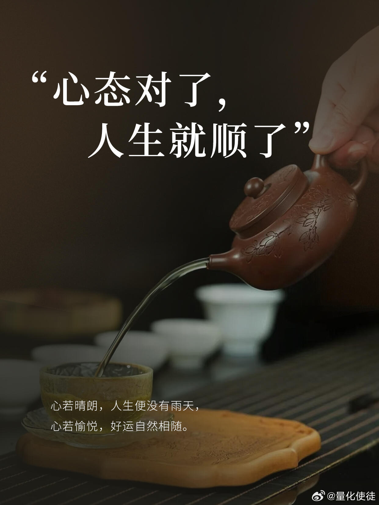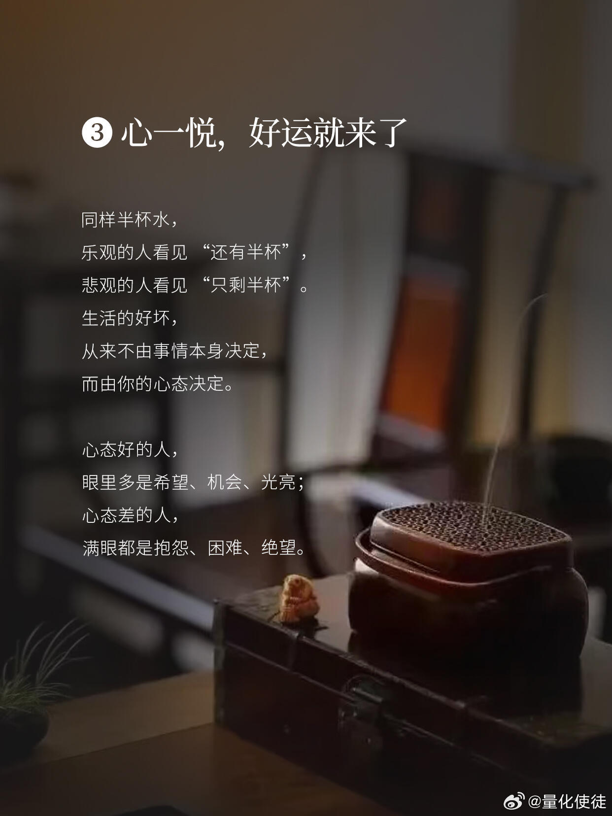 每日一善心宽·心稳·心悦 | 心态对了,人生就顺了吸引力法则里藏着一个真相:你是什么心态,就会吸引什么样的人生。心若灰暗,处处是困境;心若向阳,事事皆转机。很多时候,不是人生太难,是你的心态还没摆正。心态对了,路就宽了,人就顺了。·❶ 心一宽,病就少了老话说:病由心生,境由心造。心里装着烦恼、怨气、纠结,身体就会跟着沉重;心里放得下、看得开、常微笑,身体自然轻松舒畅。人生风雨难免,若事事较真、日日焦虑,再健康的身体也会垮掉。心宽一寸,病退一丈;宽恕别人,也是善待自己。保持一颗从容豁达的心,就是最好的养生,最灵的药方。·❷ 心一稳,事就成了人生不如意十之八九,谁都会遇到坎坷、挫折、突如其来的变故。很多人一遇事就慌、一受挫就乱,越急越错,越忙越乱。其实,事压不垮人,情绪才会压垮人。心态稳的人,遇事不慌、遇难不避,先稳住情绪,再理清思路,最后踏实行动。越是低谷,越沉得住气;越是艰难,越耐得住性子。《绿皮书》里说的:“无法改变环境时,就调整自己的心态。”心稳了,手脚就稳;再难的事,也能慢慢做成。心定如山,事才能顺如水。·❸ 心一悦,好运就来了同样半杯水,乐观的人看见 “还有半杯”,悲观的人看见 “只剩半杯”。生活的好坏,从来不由事情本身决定,而由你的心态决定。心态好的人,眼里多是希望、机会、光亮;心态差的人,满眼都是抱怨、困难、绝望。你用积极迎接世界,世界就回你温暖;你用消极对抗生活,生活就回你疲惫。所谓好运,不过是长期保持的好心情。心若晴朗,人生便没有雨天;心若愉悦,好运自然相随。💖写在最后:人生这趟旅程,境遇难料,世事无常,唯一能牢牢握在手里的,就是我们的心态。心宽,身体就安康;心稳,事情就顺畅;心悦,好运就常在。往后余生,不纠结、不内耗、不抱怨、不慌张,稳住心态,向阳而行。你会慢慢发现:心态对了,人生就真的顺了。