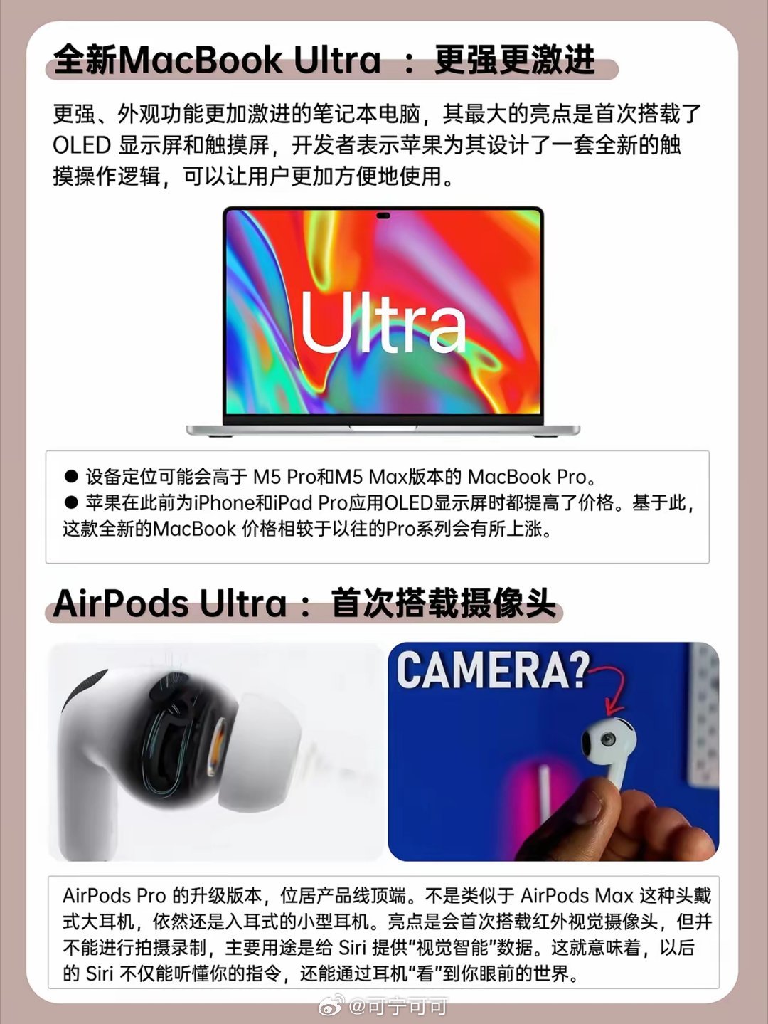 炸裂!苹果 Ultra 全家桶提前炸场,三款王炸新机直接把高端卷到新高度 🚨iPhone Ultra 首款折叠屏 iPhone 实锤,内外屏+屏下方案,碾压所有前代;MacBook Ultra 定位越级,性能甚至压过 M5 Pro/Max 版 MacBook Pro,外观设计更激进;AirPods Ultra 首次内置红外视觉摄像头,智能交互直接升级大版本。刚发完 M5 系列新品,苹果立刻再丢一轮核弹级更新。这波不是挤牙膏,是全面越级。果粉准备好钱包,2026 年的苹果高端线要彻底封神。苹果Ultra新机曝光 MacBookUltra iPhoneUltra折叠屏
