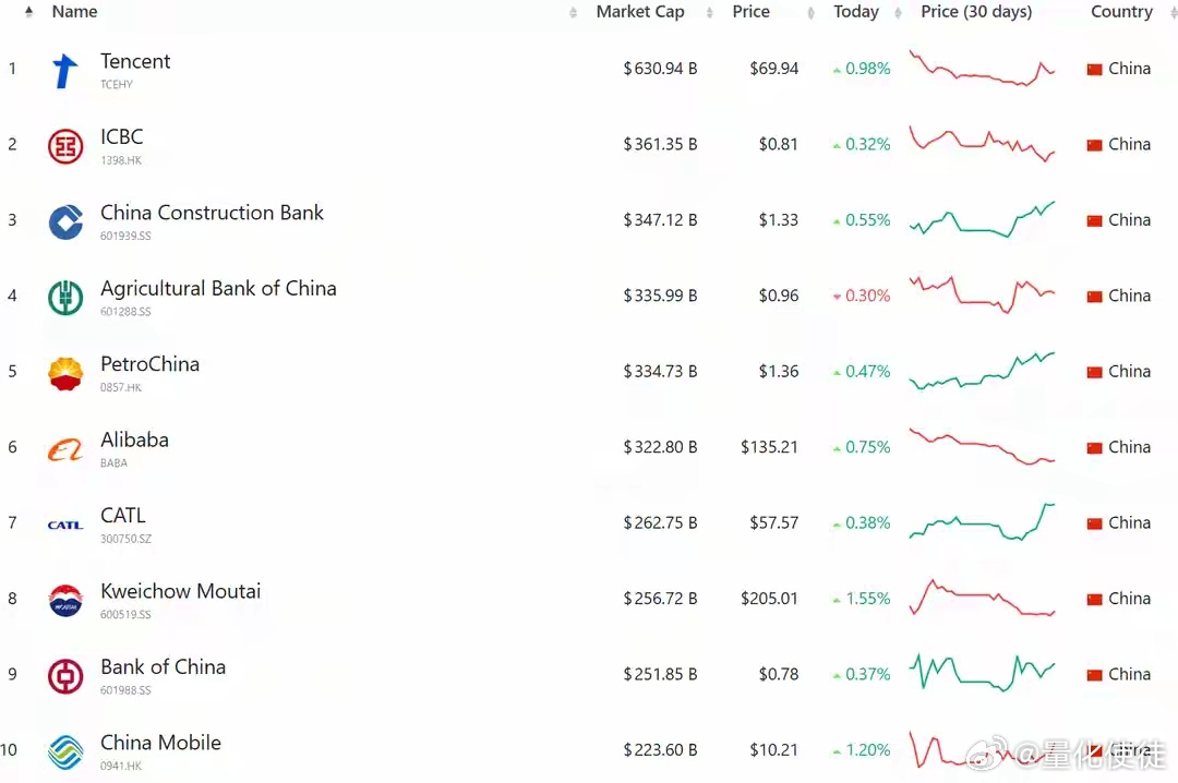再看看中国市值排名前10的企业,如下图所示,分别是腾讯、工商银行、建设银行、农业银行、中国石油、阿里巴巴、宁德时代、贵州茅台、中国银行,中国移动。