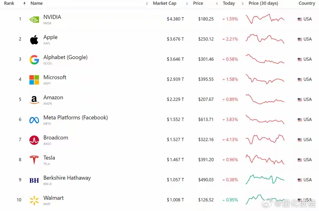 先看美国市值排名前10的企业,如下图所示,前10大企业,分别是英伟达、苹果、谷歌、亚马逊、Meta、博通、特斯拉、伯克希尔·哈撒韦公司、沃尔玛。
